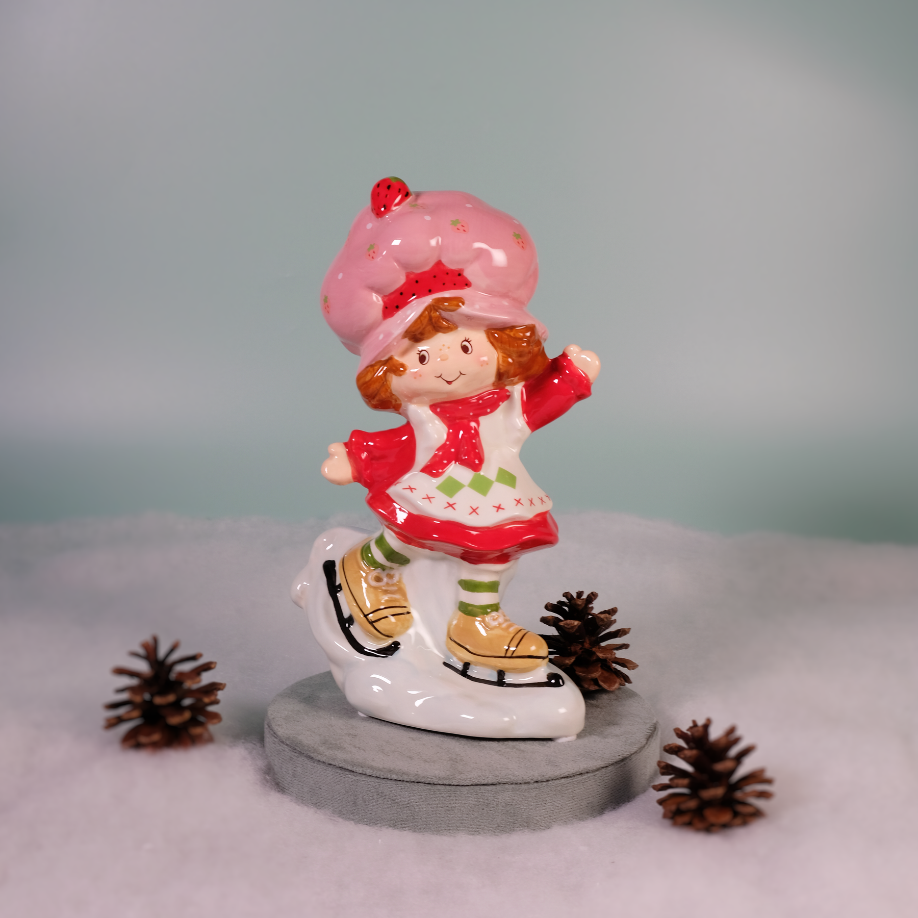 Glide into the holiday spirit with this adorable Strawberry Shortcake Ice Skater Figurine! ⛸️🍓 This charming ceramic piece features Strawberry Shortcake in a cute red coat, striped green and white stockings, and a sweet strawberry-themed hat as she joyfully skates across the ice. The delicate details, from her rosy cheeks to her golden ice skates, add a touch of nostalgia and cheer to your holiday decor.
