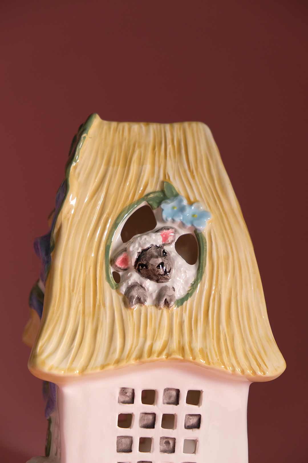 The Lambkins Lane Candle House is a sweet countryside cottage filled with gentle charm and pastoral whimsy. This beautifully sculpted ceramic home features soft blush walls, a warm golden roofline, and delicate hand-painted morning glory blooms in dreamy shades of lavender and blue cascading down the front. 🐑🌸