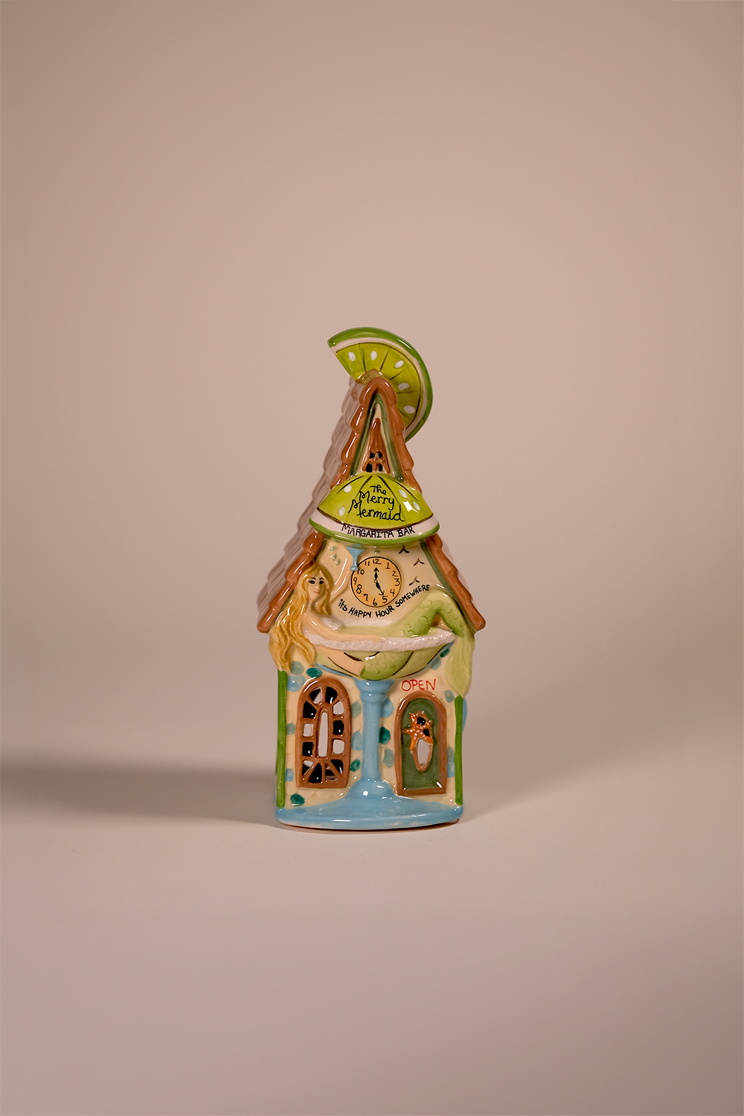 This playful candle house features a lounging mermaid enjoying life by the shore, with a cheerful sign reading “The Merry Mermaid Margarita Bar.” A bright lime wedge crowns the roof, while colorful coastal details, ocean-inspired hues, and a tiny “Open” door invite guests in for seaside refreshment. A whimsical clock detail even reminds us that “It’s Happy Hour Somewhere.”