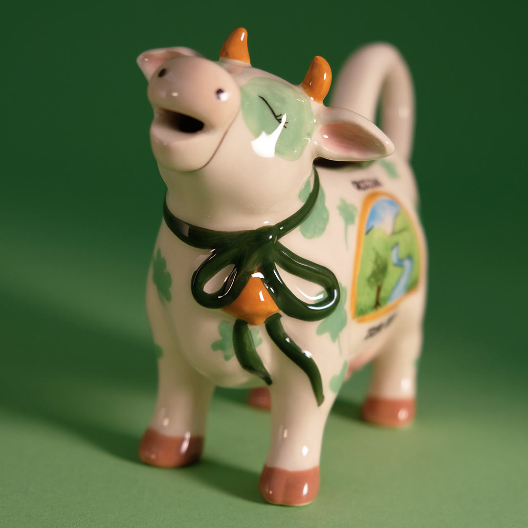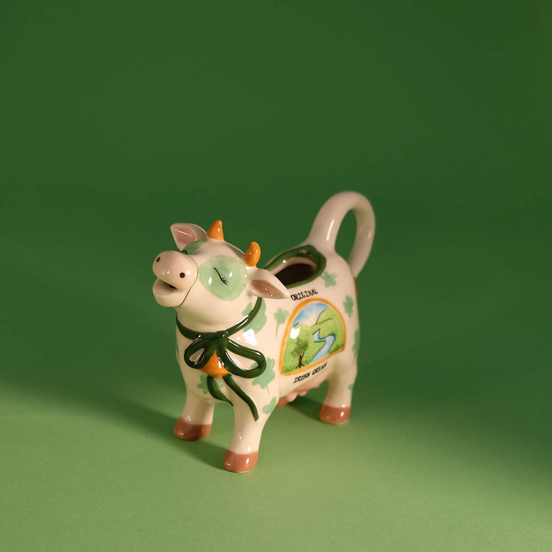 This whimsical ceramic creamer is shaped like a cheerful cow, hand-painted with soft green accents, shamrocks, and a pastoral Irish-inspired scene on its side. Finished with a sweet ribbon detail and gentle expression, it brings personality and warmth to every pour. The tail doubles as a handle while the opening at the top makes serving cream or milk easy and mess-free. 🐄🍀