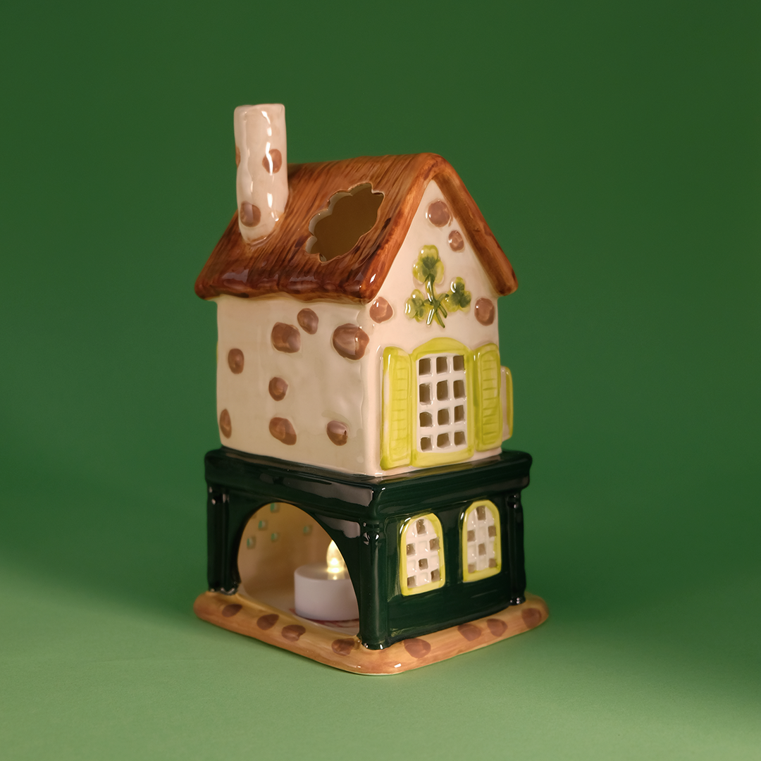 This hand-painted ceramic candle house captures the heart of a classic Irish pub, complete with a welcoming green storefront, shamrock details, and a cheerful leprechaun keeping watch. The front reads “The Leapin’ Leprechaun – Est. 1866”, while the cutout windows and roof opening allow candlelight to glow warmly from within, creating a soft, inviting ambiance. 🏠🍀