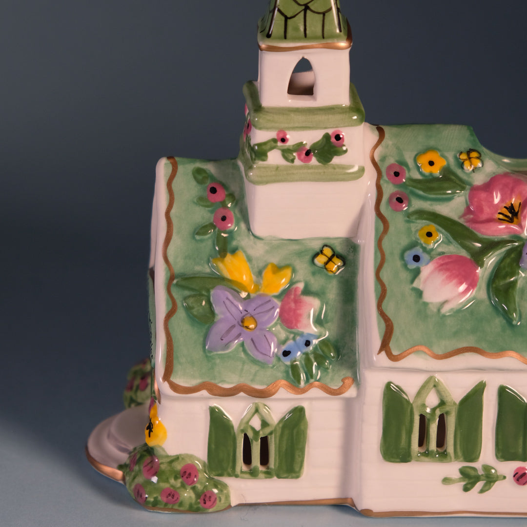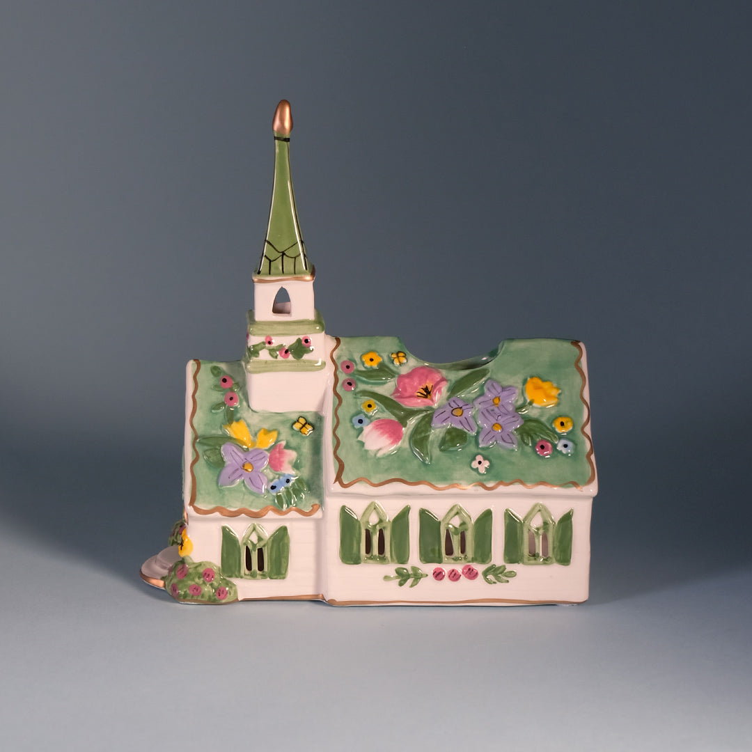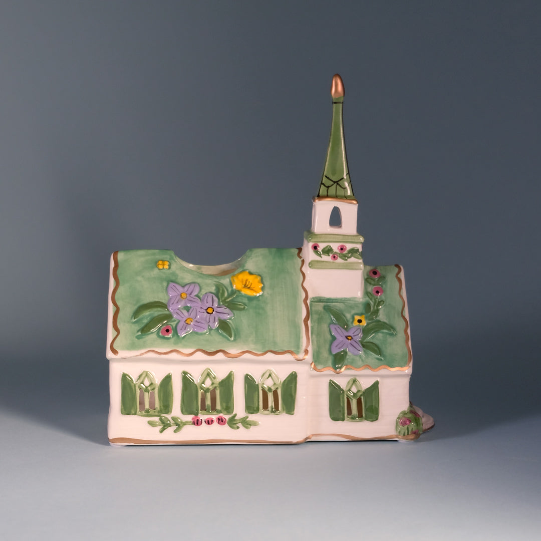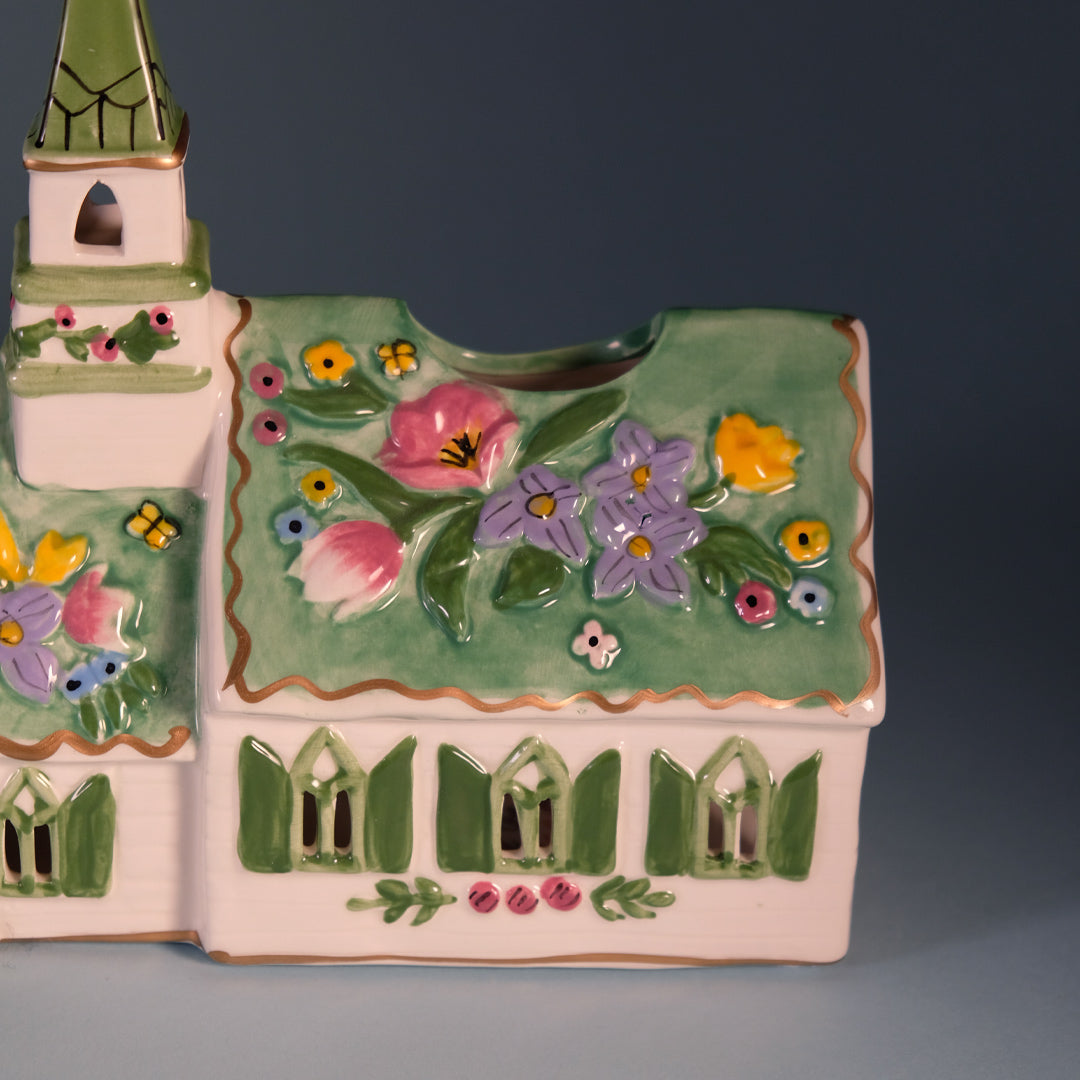This charming Miracles Church Candle House is a beautifully detailed ceramic piece that brings warmth, faith, and gentle light to your space. Hand-painted in soft pastel tones, it features a quaint church adorned with blooming florals, green shutters, and a graceful steeple topped with a subtle metallic accent. The front reads “Church of Easter Miracles,” making it especially meaningful for springtime and Easter décor. ⛪✨