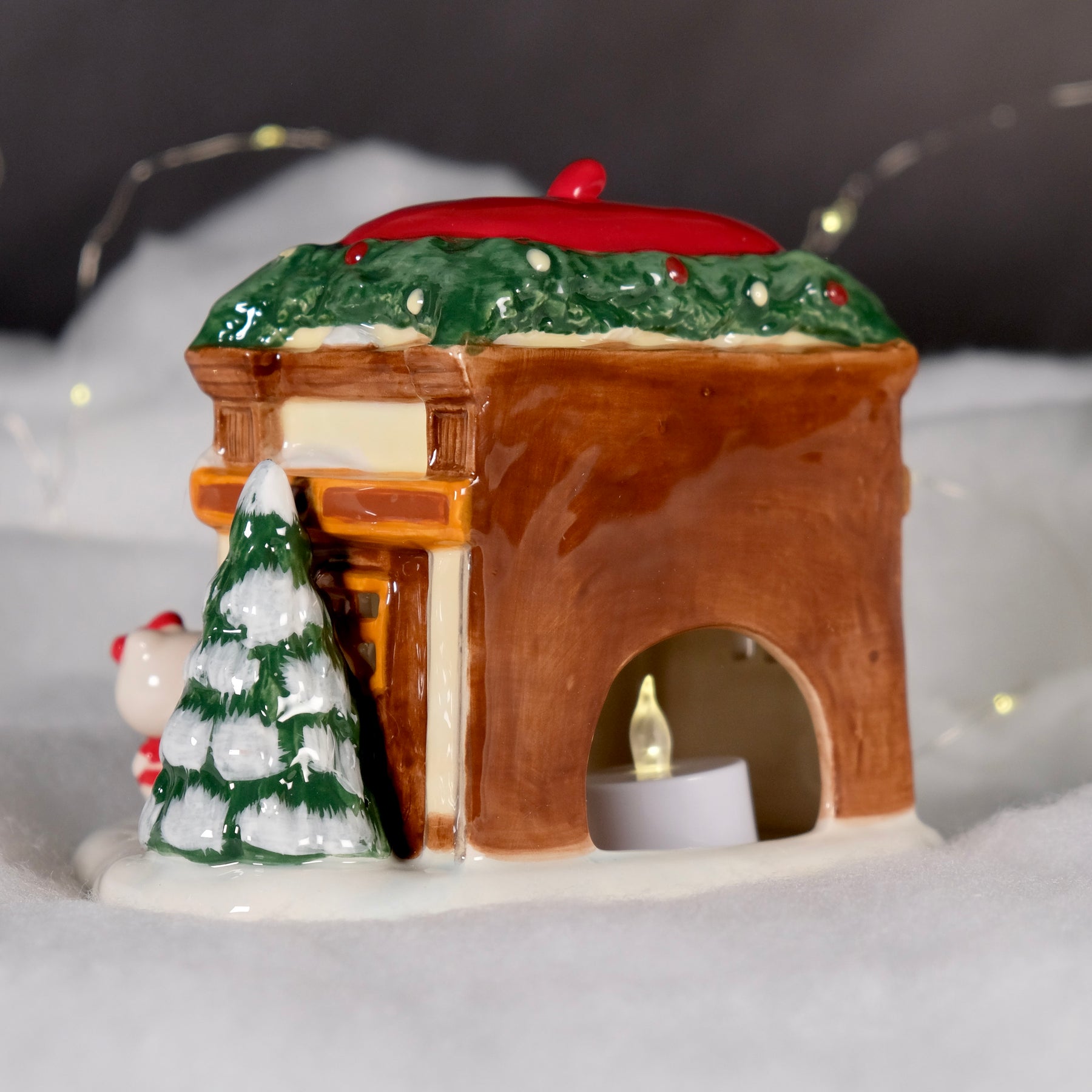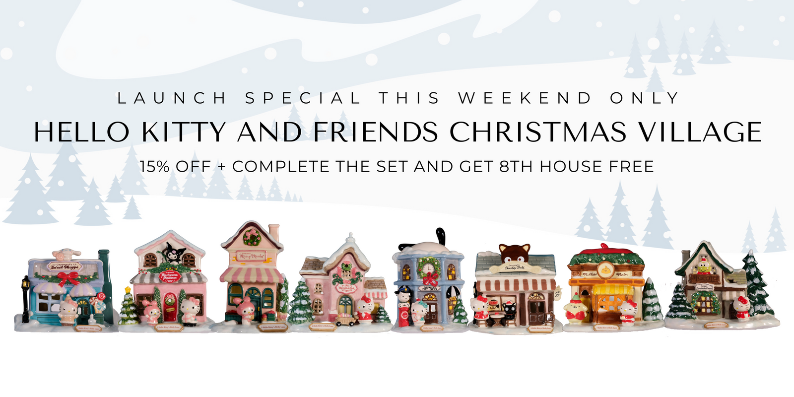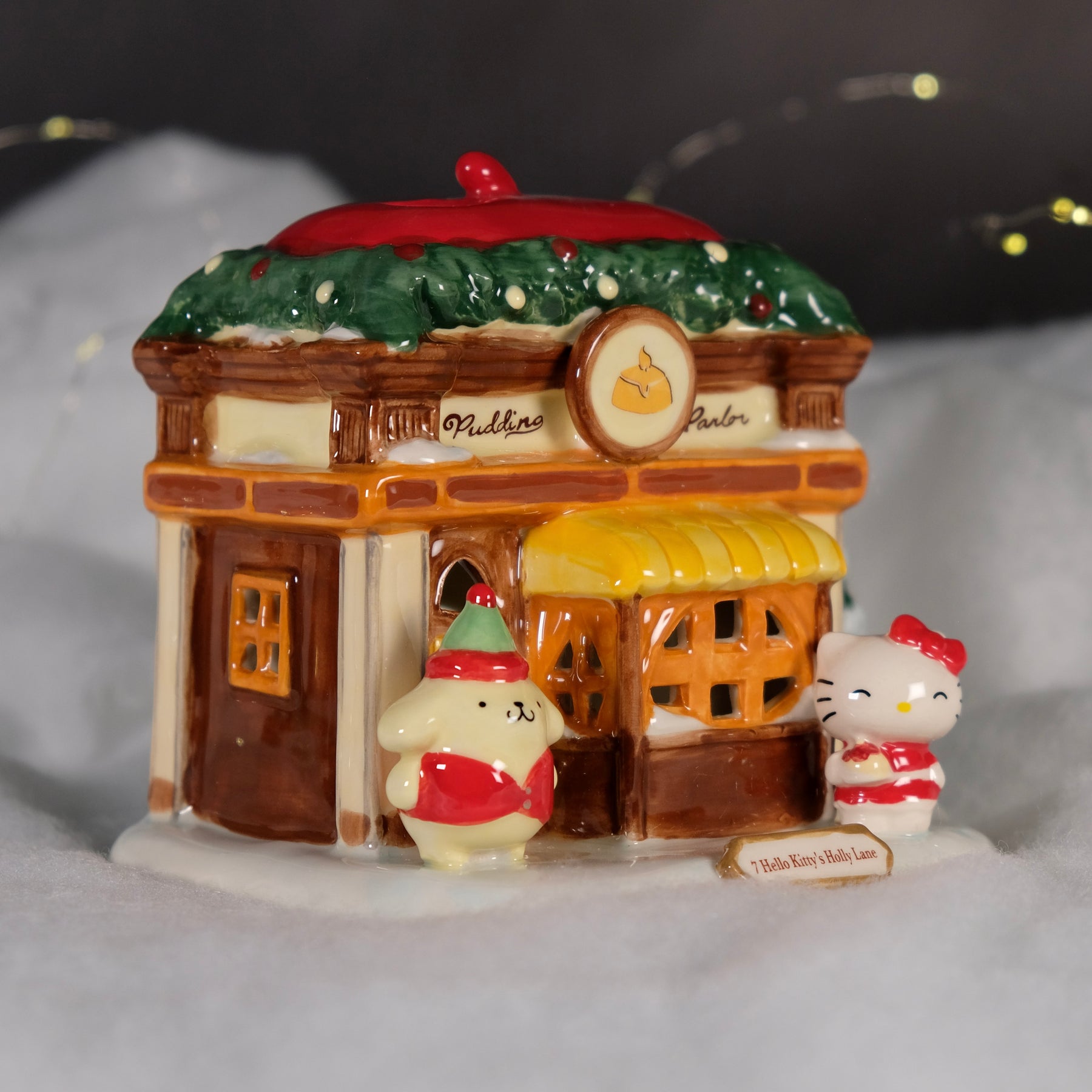 This ceramic collectible features Pompompurin and Hello Kitty dressed in festive outfits, welcoming you to their sweet pudding shop. The hand-painted details include a snowy rooftop with holly accents, a charming storefront with a yellow awning, and a frosted evergreen tree at the side. Place a tealight or battery-operated candle inside to softly illuminate the windows and create a warm, festive glow. Perfect as a holiday centerpiece, mantle decoration, or gift for Sanrio fans!
