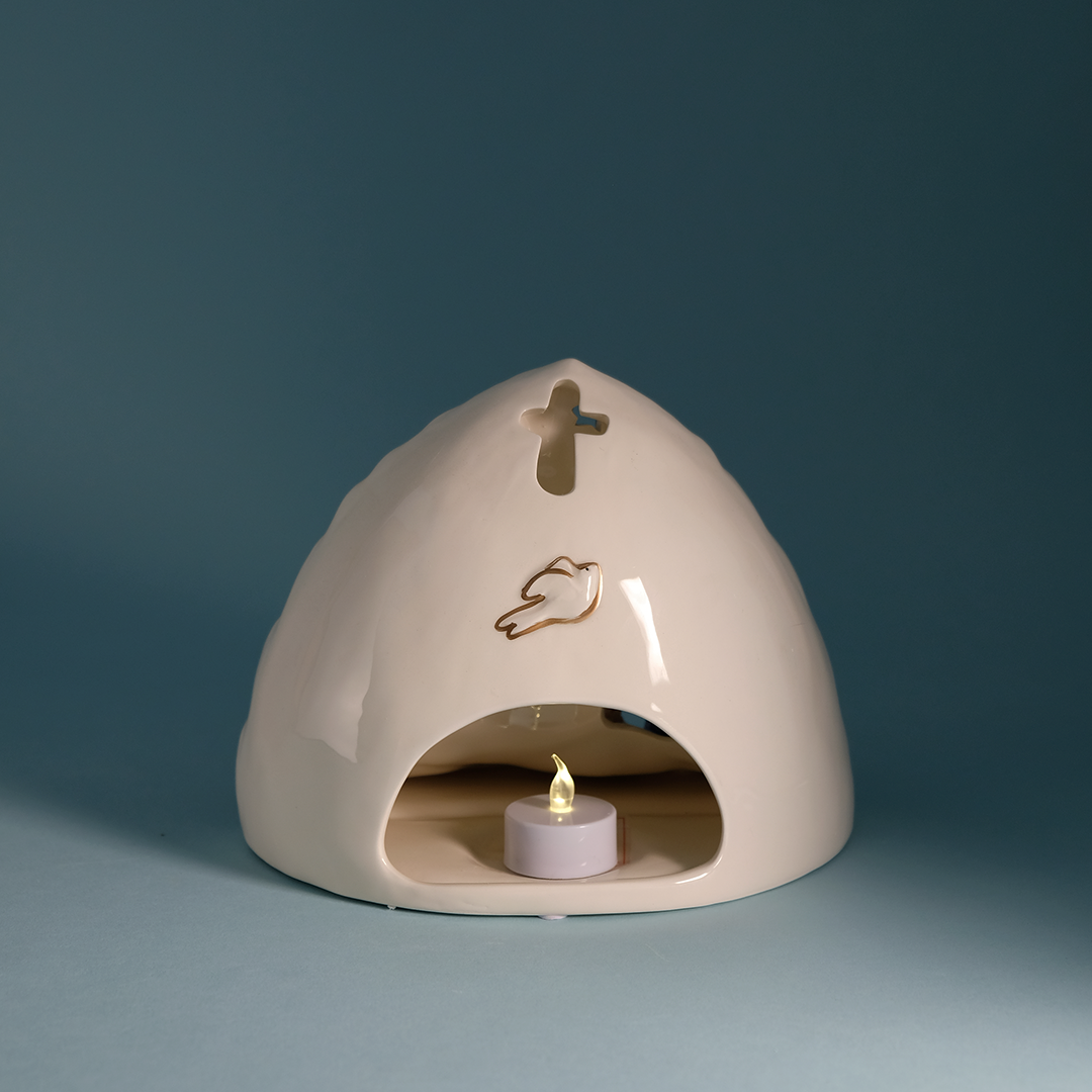 The Easter Passion Scene is a beautifully crafted ceramic piece that captures the hope and glory of the Resurrection. Set beneath a hand-painted arch of vibrant skies and shining stars, the scene features the empty tomb, an angel proclaiming the Good News, and devoted figures gathered in awe. Three crosses rise in the distance, completing this powerful depiction of Easter morning.