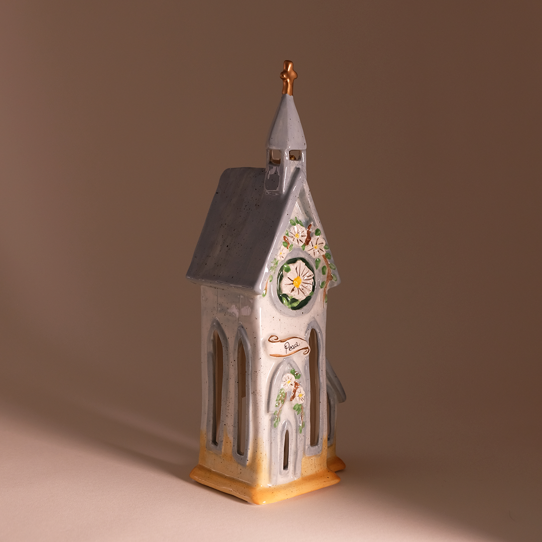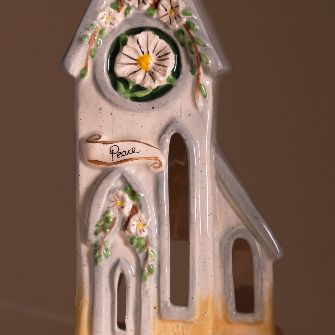 Softly speckled detailing and dimensional blossoms frame the round window, while cutout windows allow candlelight to glow from within. When paired with a standard tea-light or small LED candle, the church illuminates with a peaceful radiance that feels both comforting and meaningful.