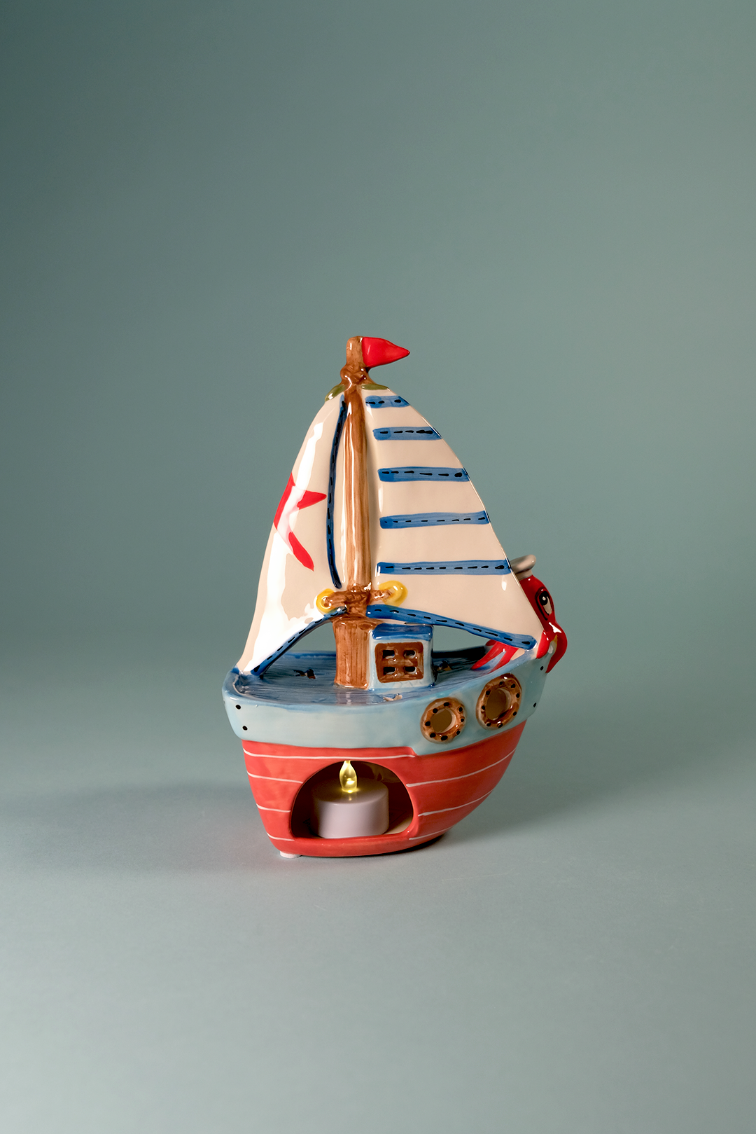 Designed as a cheerful little sailboat, this piece features striped sails, playful nautical details, and vibrant hand-painted accents that capture the spirit of life on the water. From the portholes to the lifebuoy and charming sea creature touches, every detail adds personality and storytelling to this delightful design.