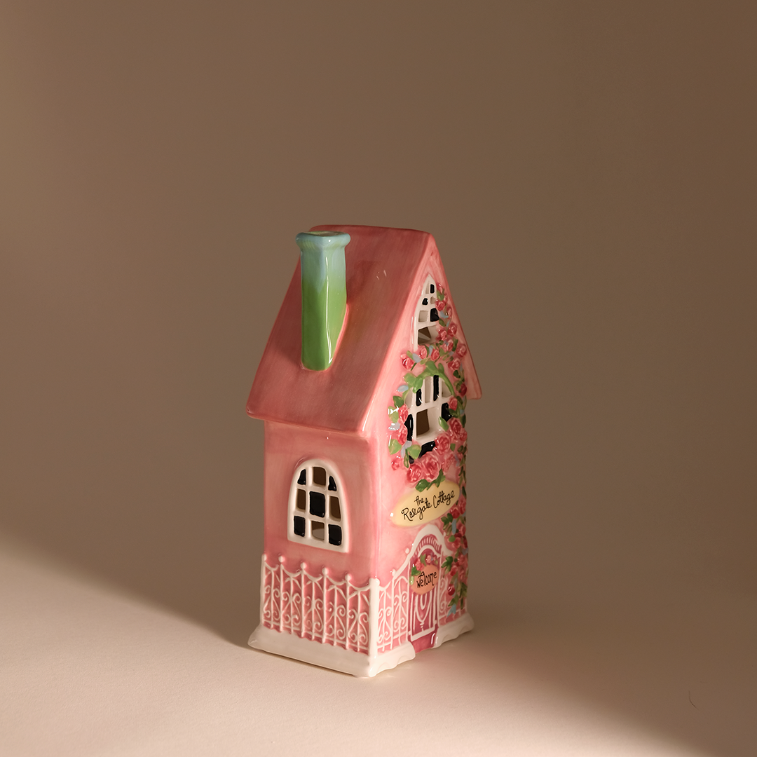 The Rosegate Cottage Candle House is a charming storybook treasure, blooming with delicate pink roses and sweet cottage details. This tall, slender ceramic home features a soft blush exterior, climbing floral vines, and an inviting little doorway marked “Welcome,” making it feel warm and full of heart.