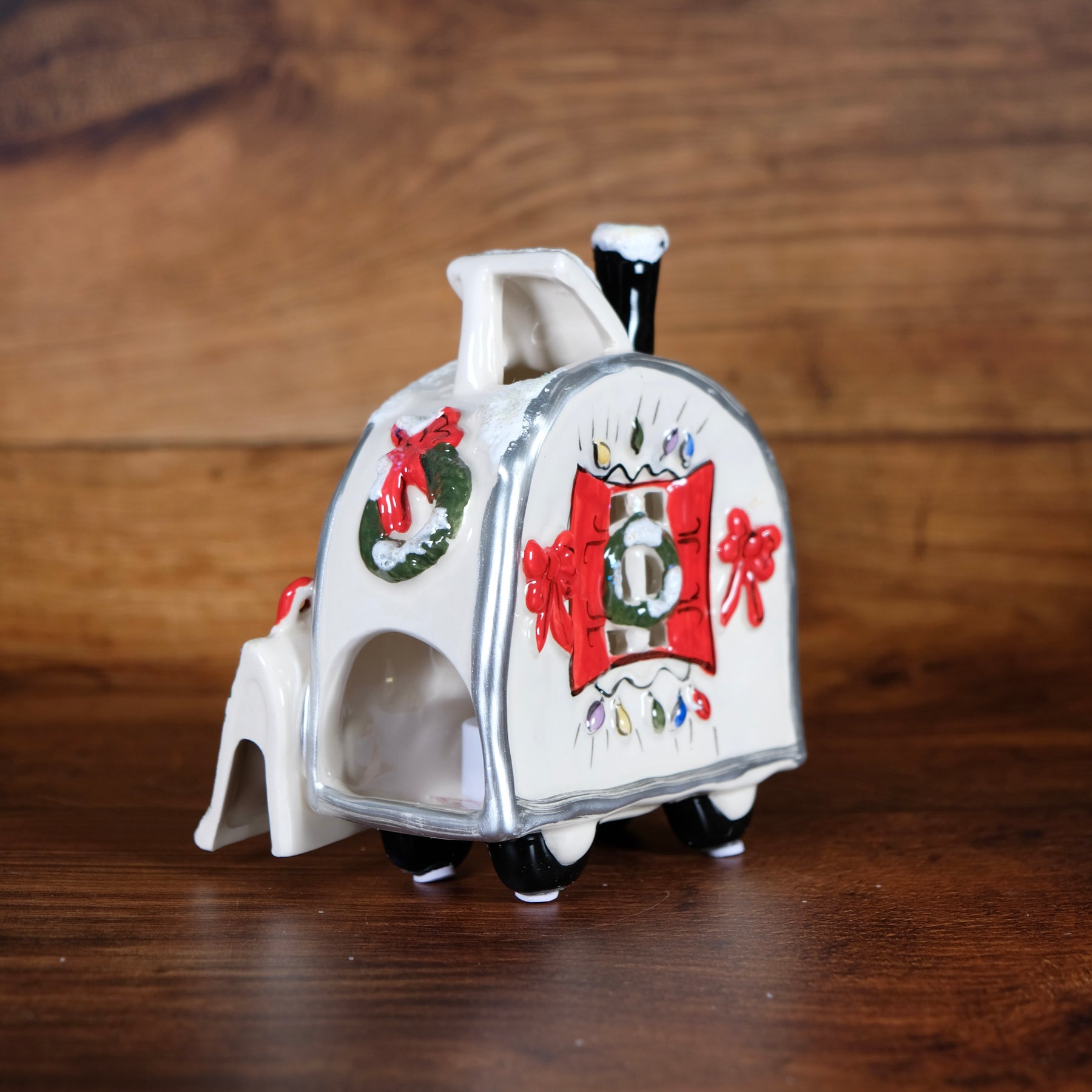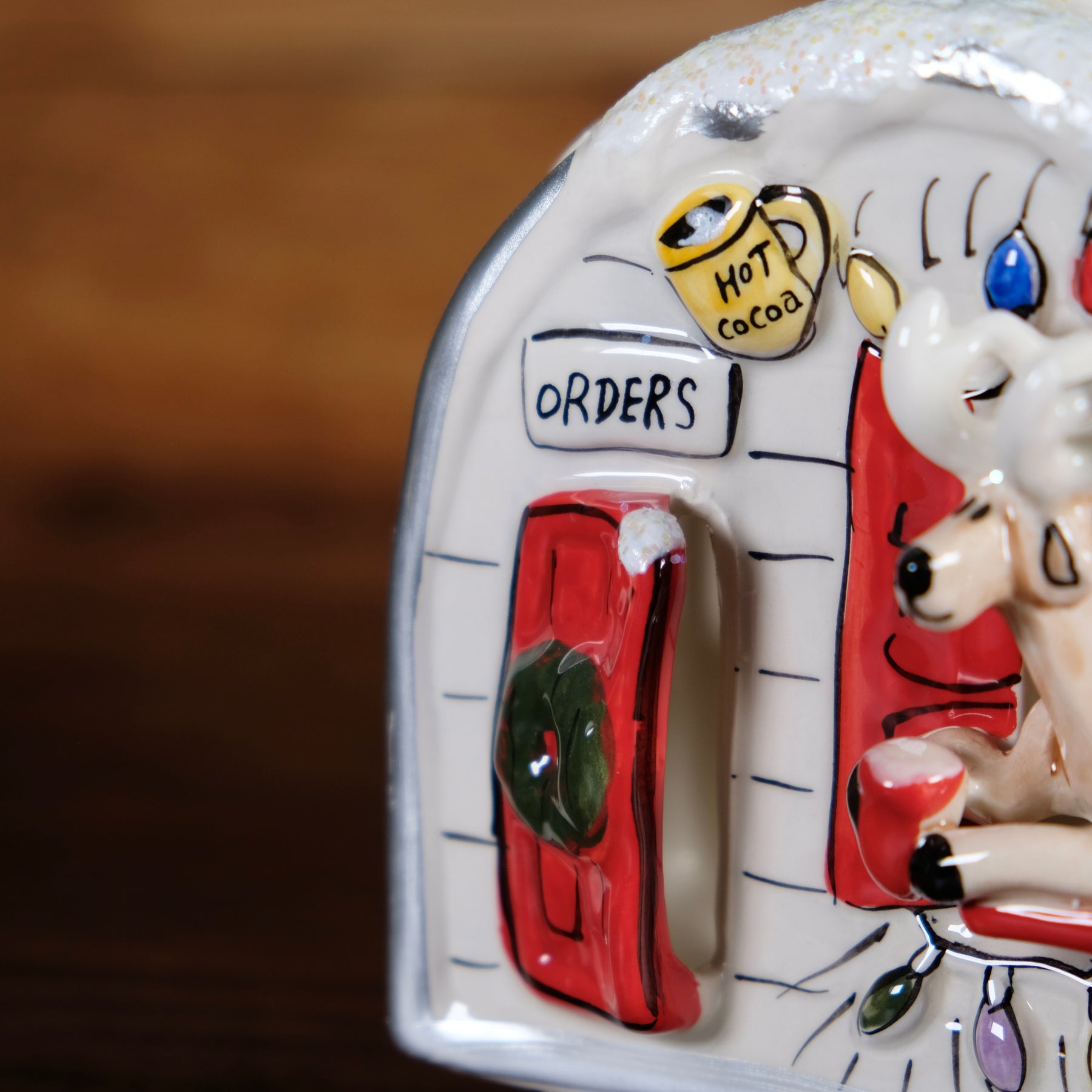Warm up your holiday season with the adorable "Prancer's Hot Chocolate Stand" Ceramic Candle House! π«π A Heather Goldminc original design, this charming piece features Prancer the reindeer, happily serving up hot cocoa from a cozy, snow-covered stand. The festive details include twinkling Christmas lights, a sign that reads "Prancer's Hot Chocolate Stand," and a cheerful red kettle. ββ¨