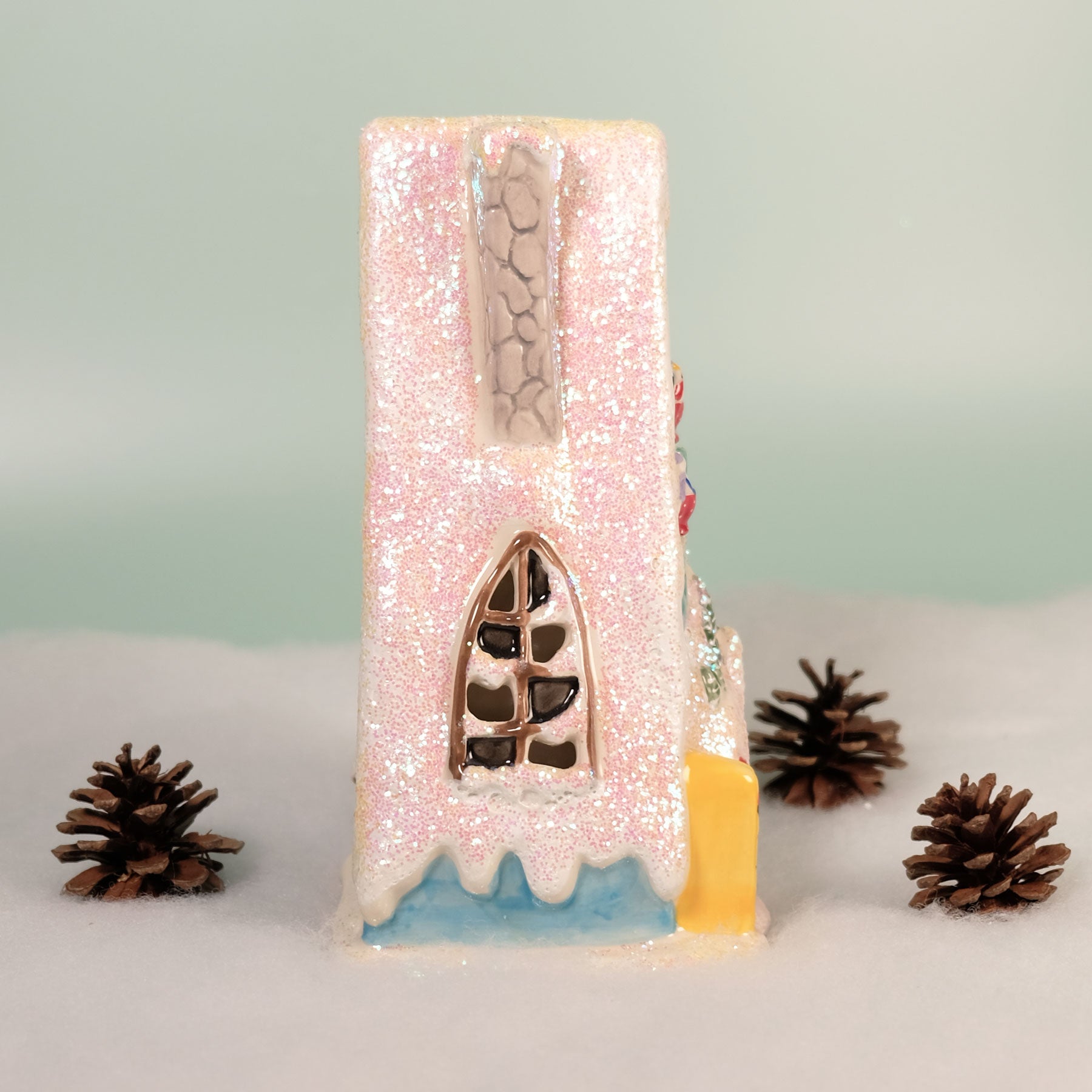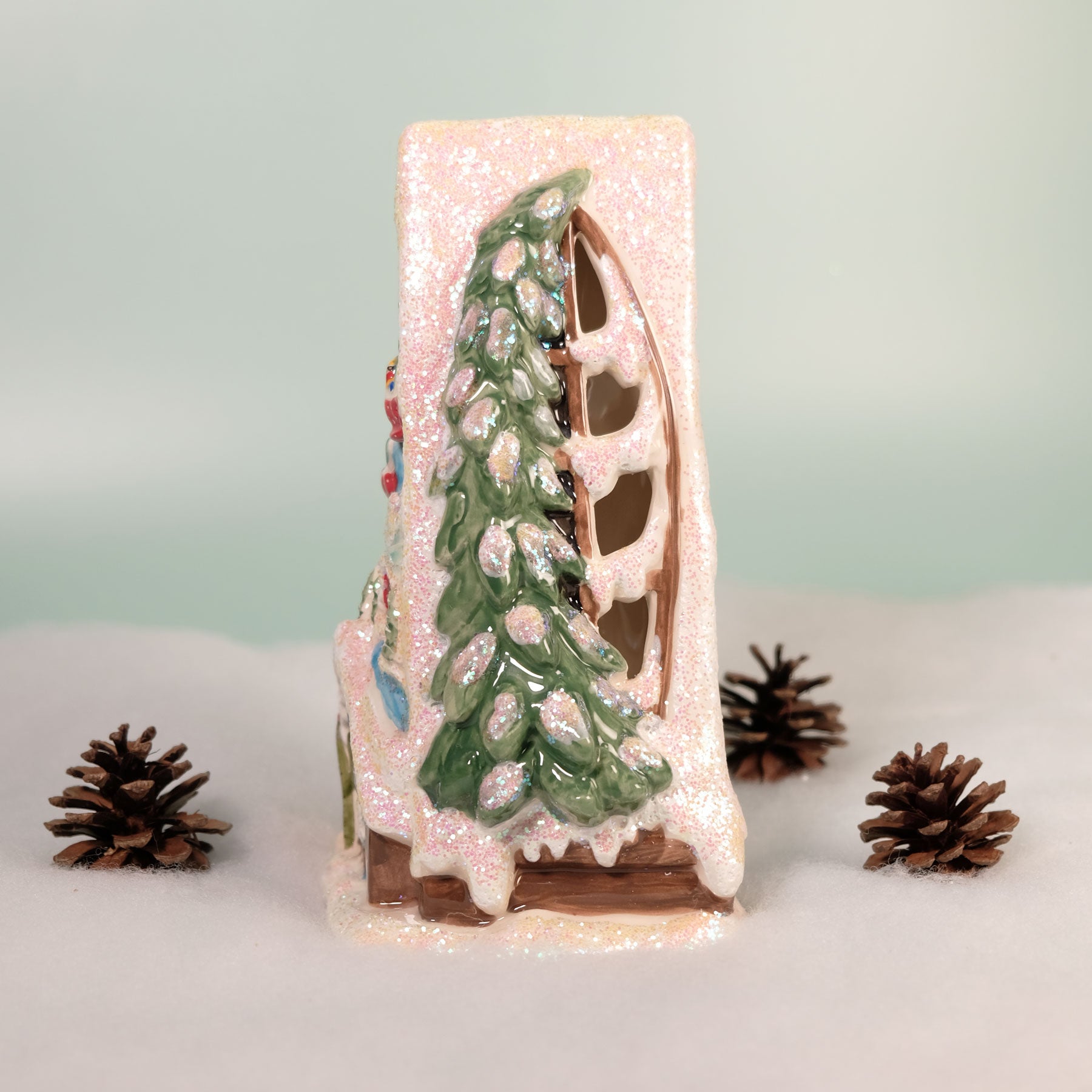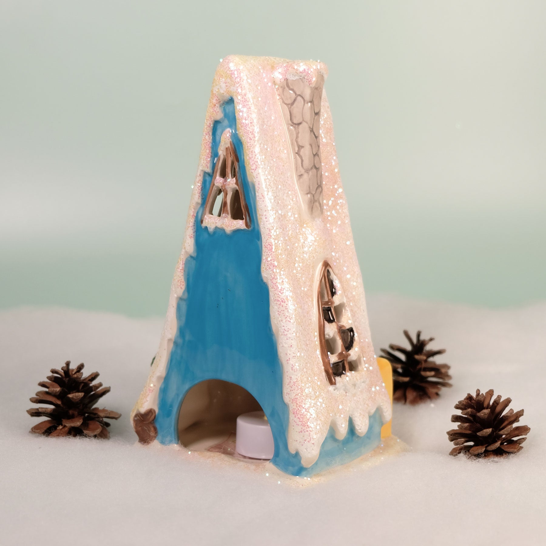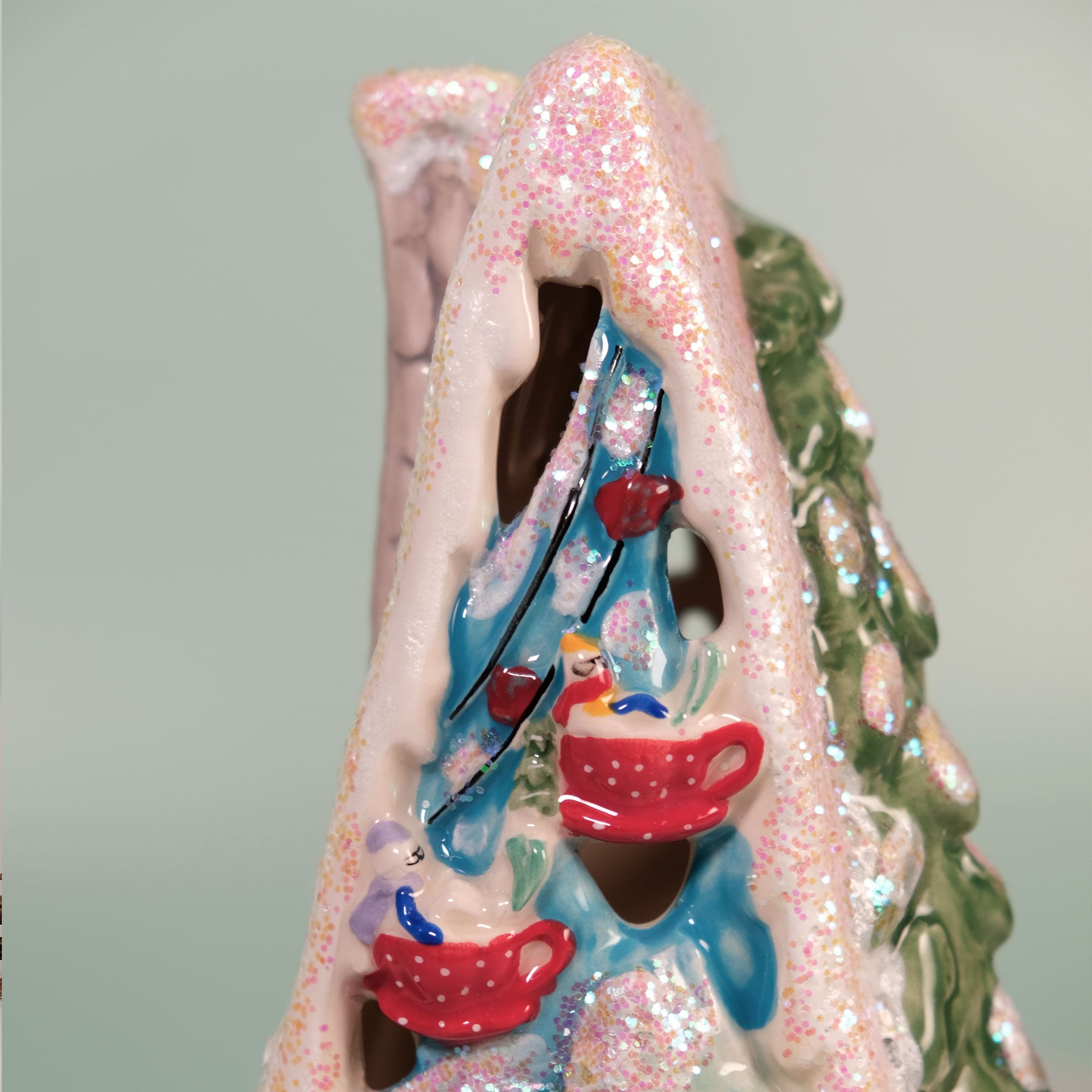 This whimsical hand-painted ceramic cottage captures the spirit of a cozy ski lodge café, nestled high in the snow-covered peaks. Glittering snow drapes over the roof, while colorful mugs and skis adorn the front — a cheerful invitation to stop in for a warm cup of cocoa after a day on the slopes. ❄️✨