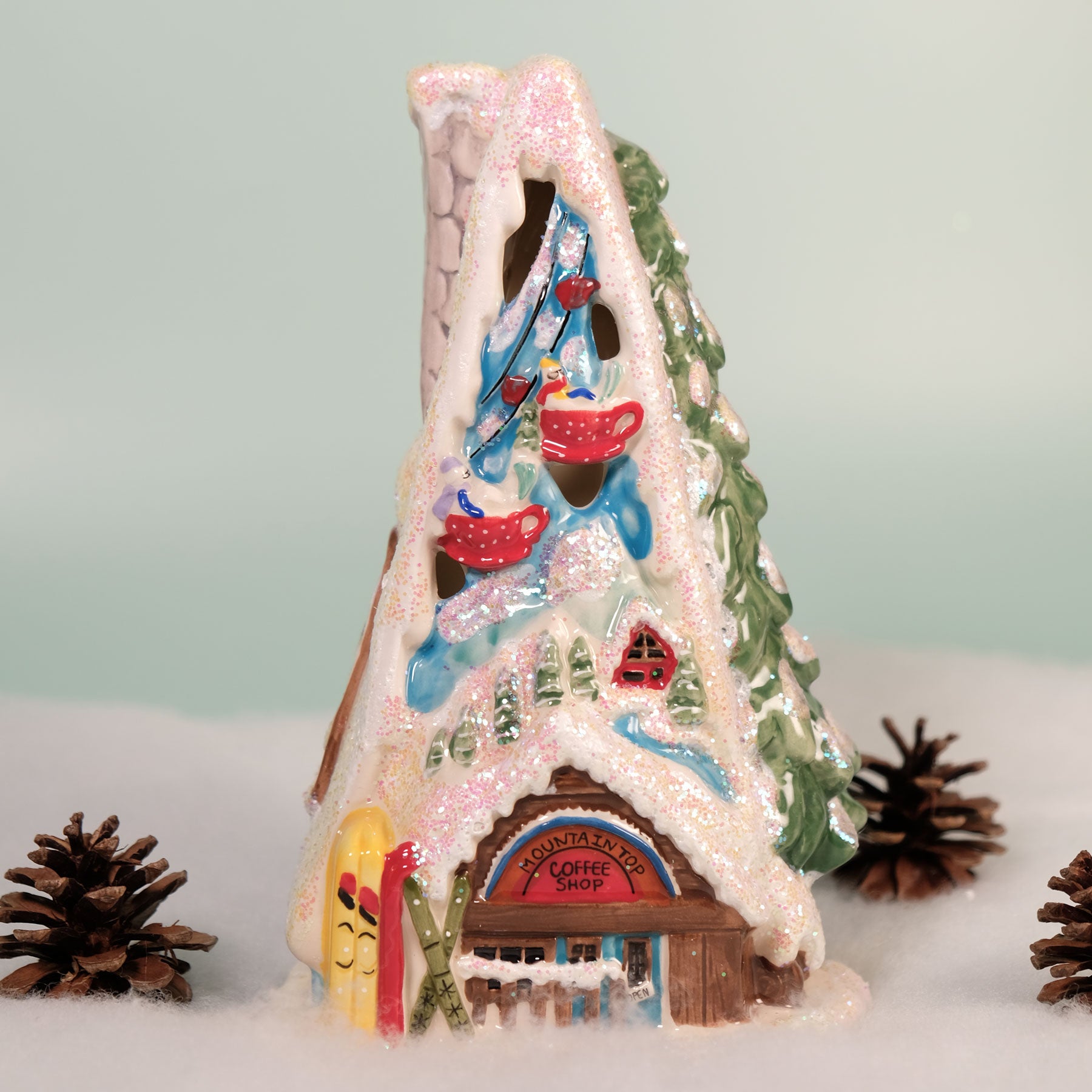 Warm up your winter wonderland with the charming Mountain Top Coffee Shop Candle House!