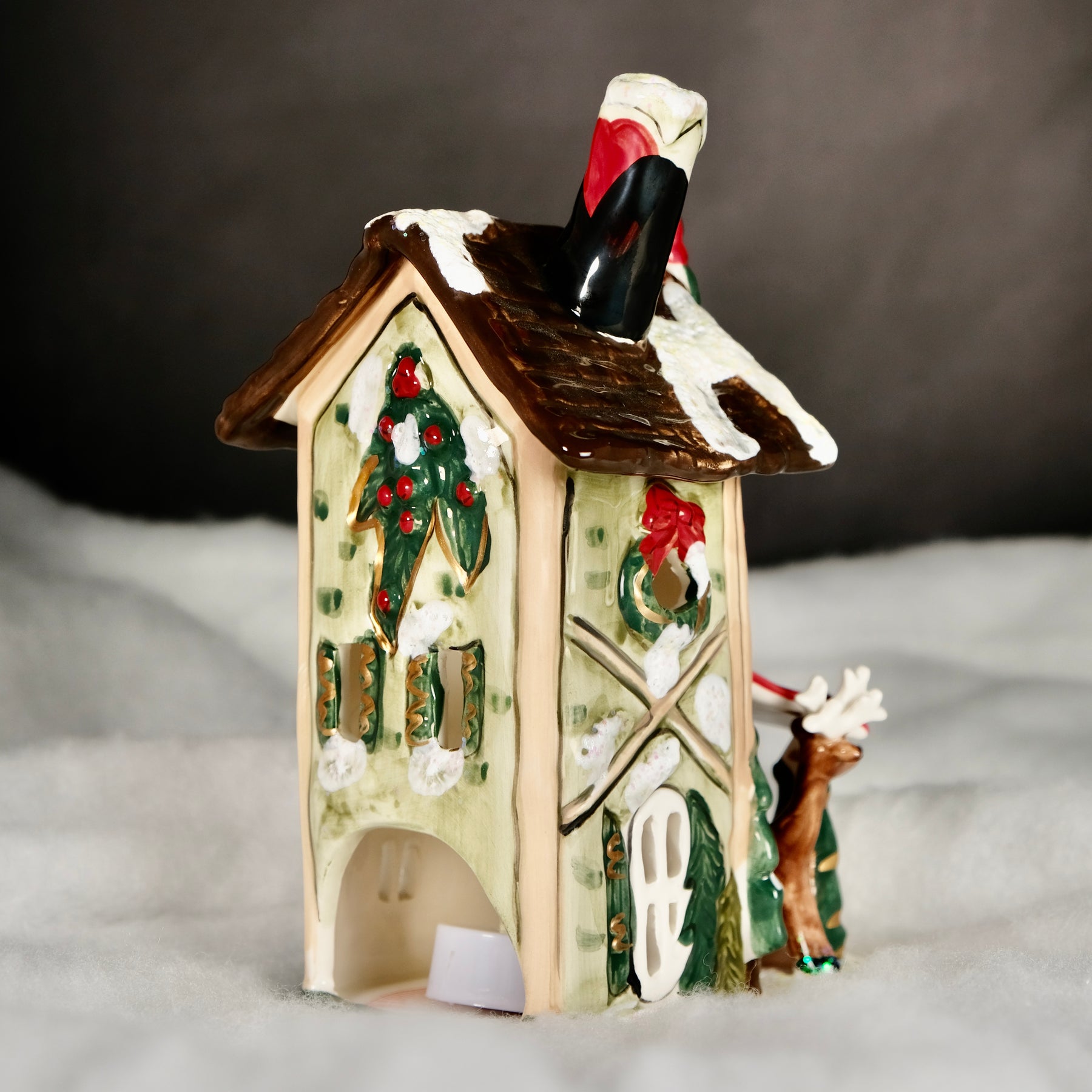 A Heather Goldminc original design, this whimsical ceramic inn is dusted with snow on the roof and sides, topped with a festive wreath, and features two charming deer ready to welcome you home for the holidays. β„οΈπŸŒŸπŸŽ