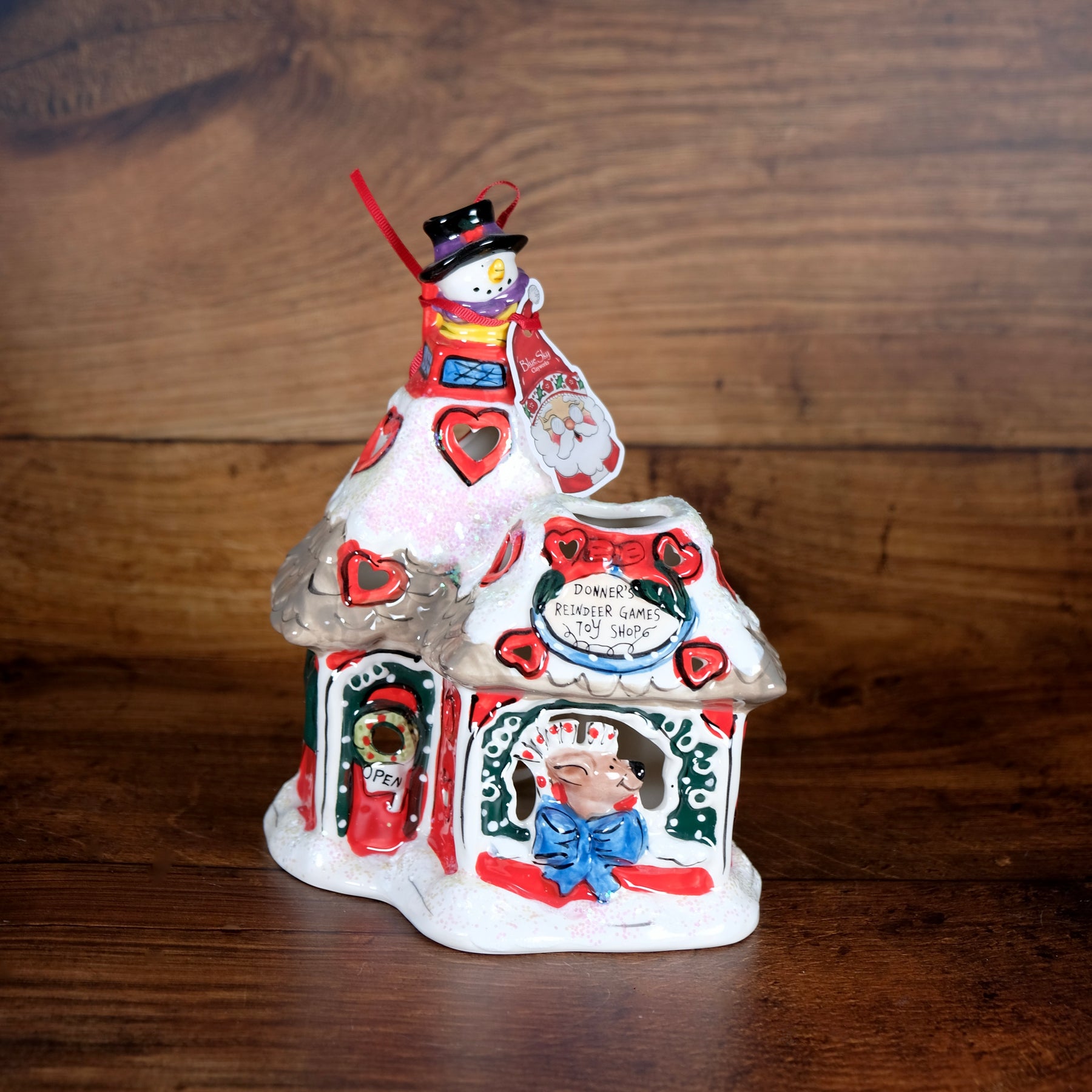 Bring playful holiday cheer to your home with the Donner's Reindeer Games Toy Shop Candle House! π π¦π A Heather Goldminc original design, this charming ceramic piece features a friendly reindeer out by the front window, while a jolly snowman perches atop the snowy chimney! βοΈβοΈβ¨