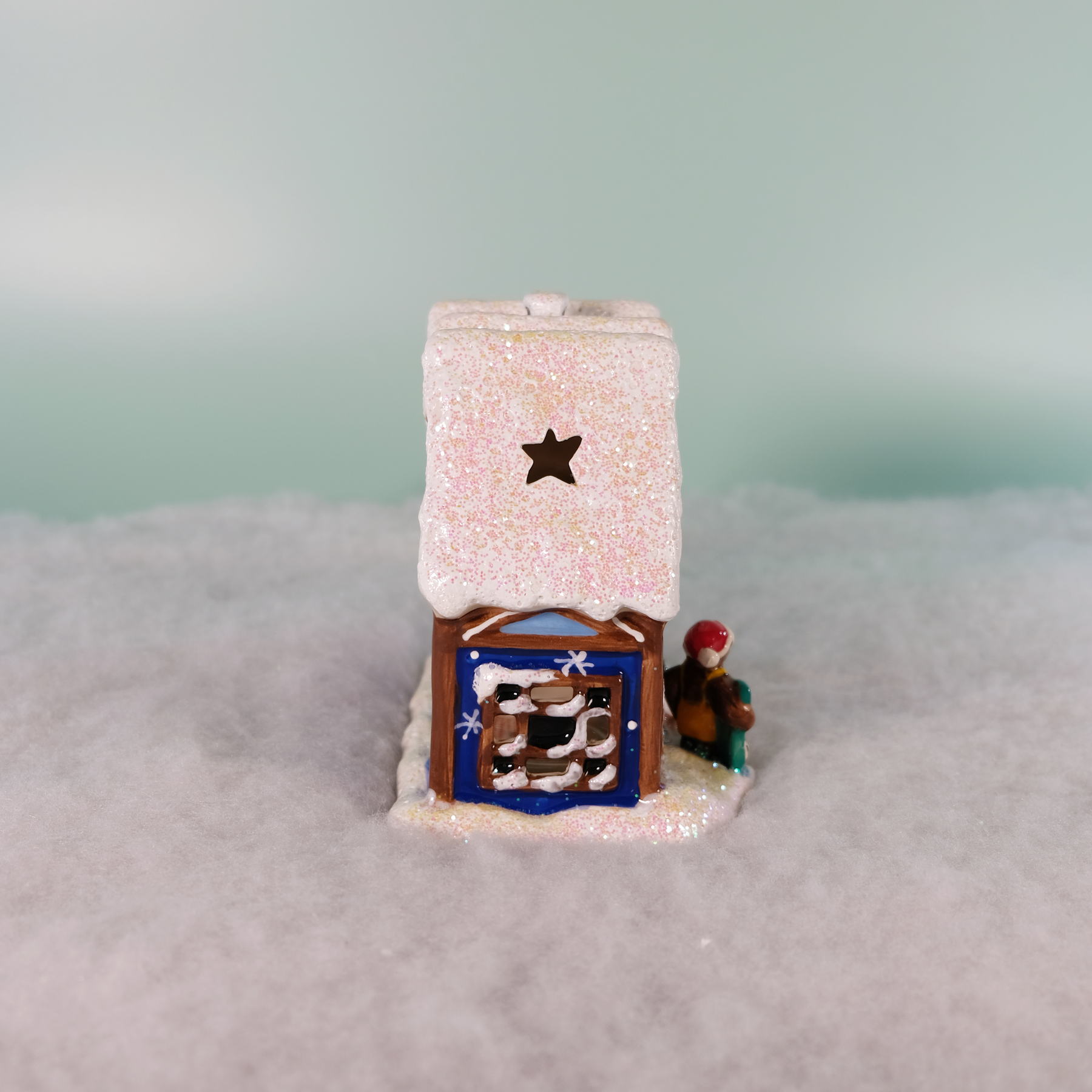 • Hand-painted ceramic candle house with detailed snowboarder scene