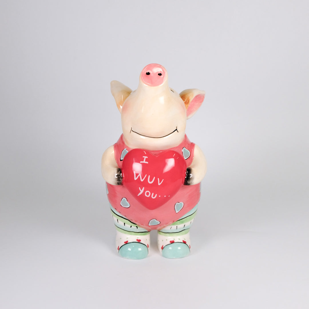 🐷 Hand-painted ceramic piglet holding a heart with “I WUV you…” message