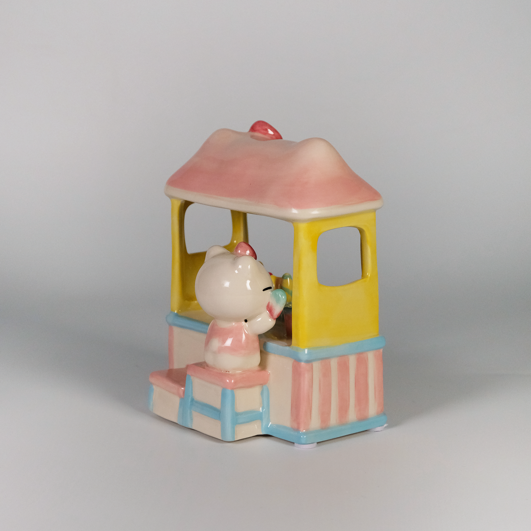 Bring a scoop of sunshine and sweetness to your space with the Hello Kitty Popsicle Stand Figurine. This adorable ceramic piece features Hello Kitty running her very own pastel-perfect popsicle stand, complete with mini frozen treats, a striped awning, and charming hand-painted details. 🍦☀️