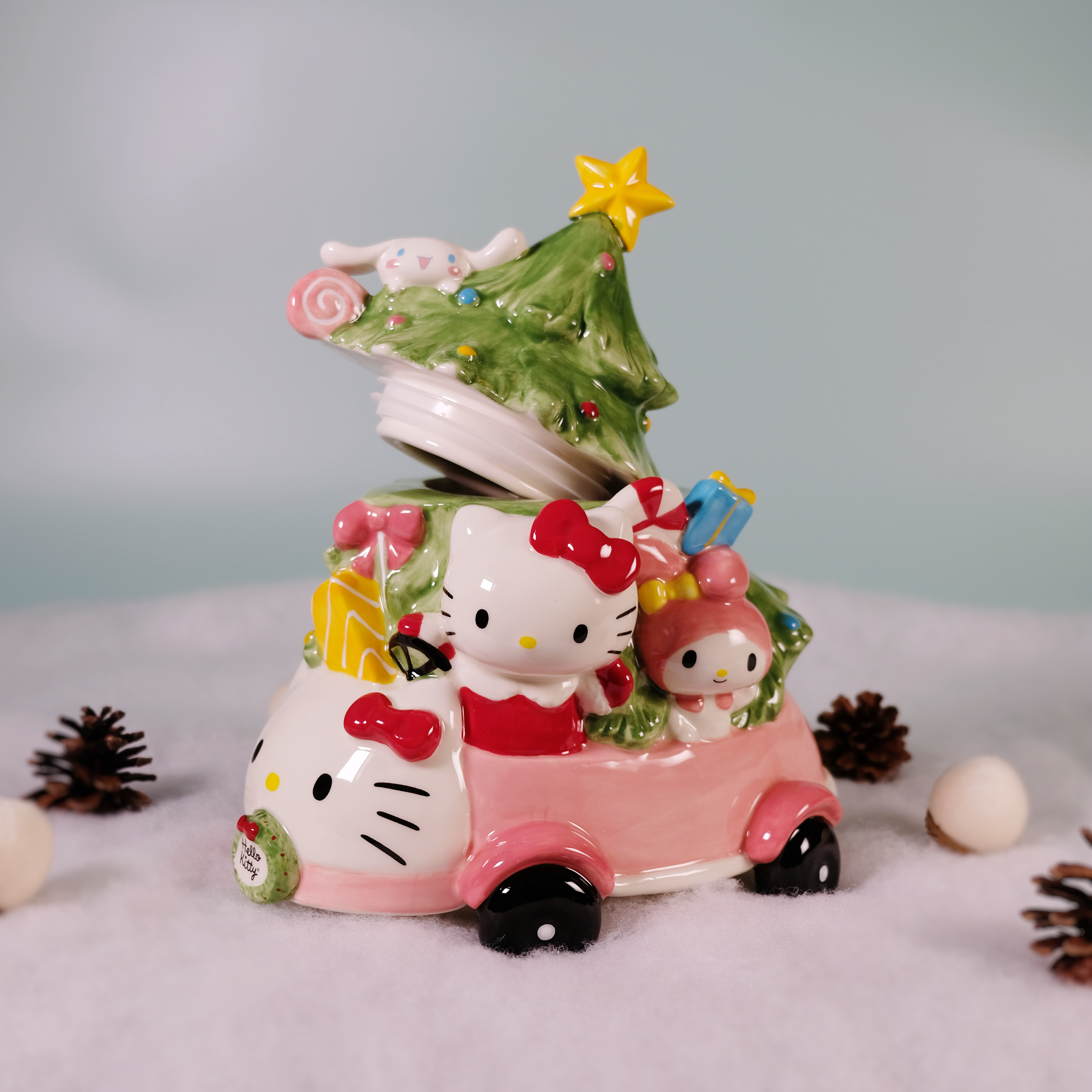 This ceramic jar features Hello Kitty driving a pink holiday car, dressed in a Santa outfit, with My Melody riding beside her. A decorated Christmas tree sits on top, complete with colorful ornaments, presents, and a yellow star. Cinnamoroll peeks out playfully from behind the tree, surrounded by holiday treats like candy canes and lollipops.