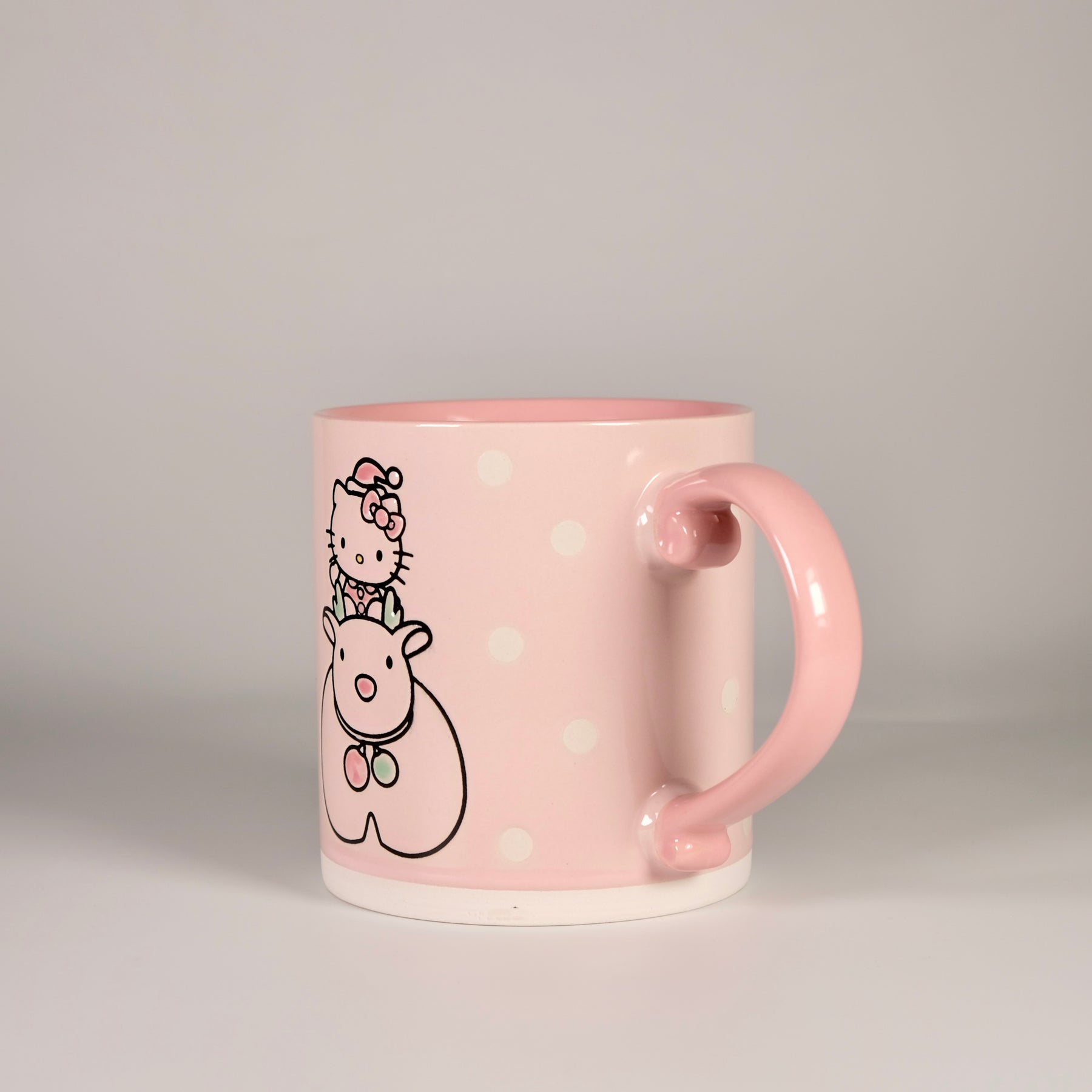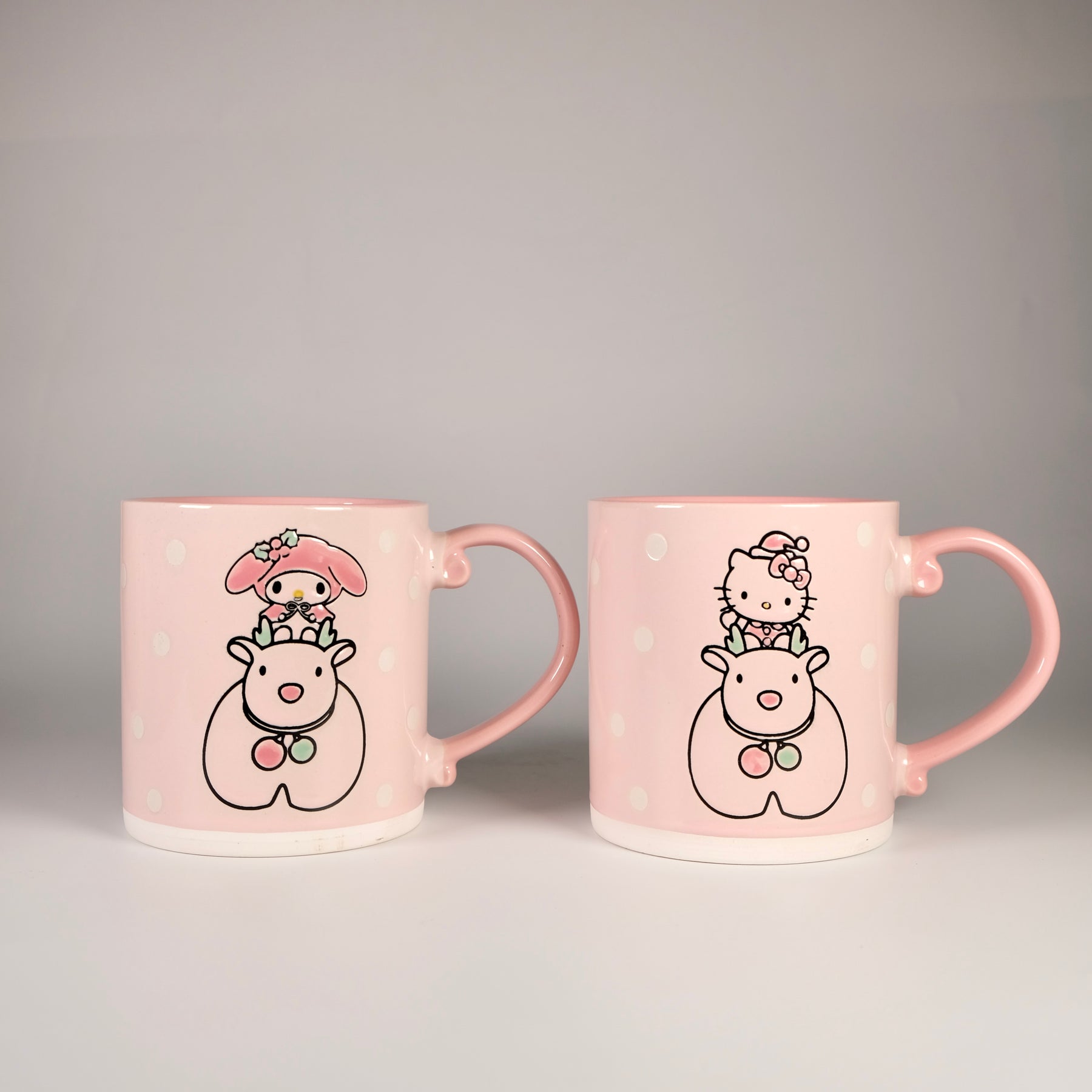 Each pastel pink mug features a delightful polka-dot design with your favorite Sanrio friends riding on reindeer โ Hello Kitty in her festive Santa hat and My Melody with her signature bow. With a glossy finish and roomy 21 oz capacity, these mugs are perfect for sharing hot cocoa, coffee, or tea during cozy winter mornings.