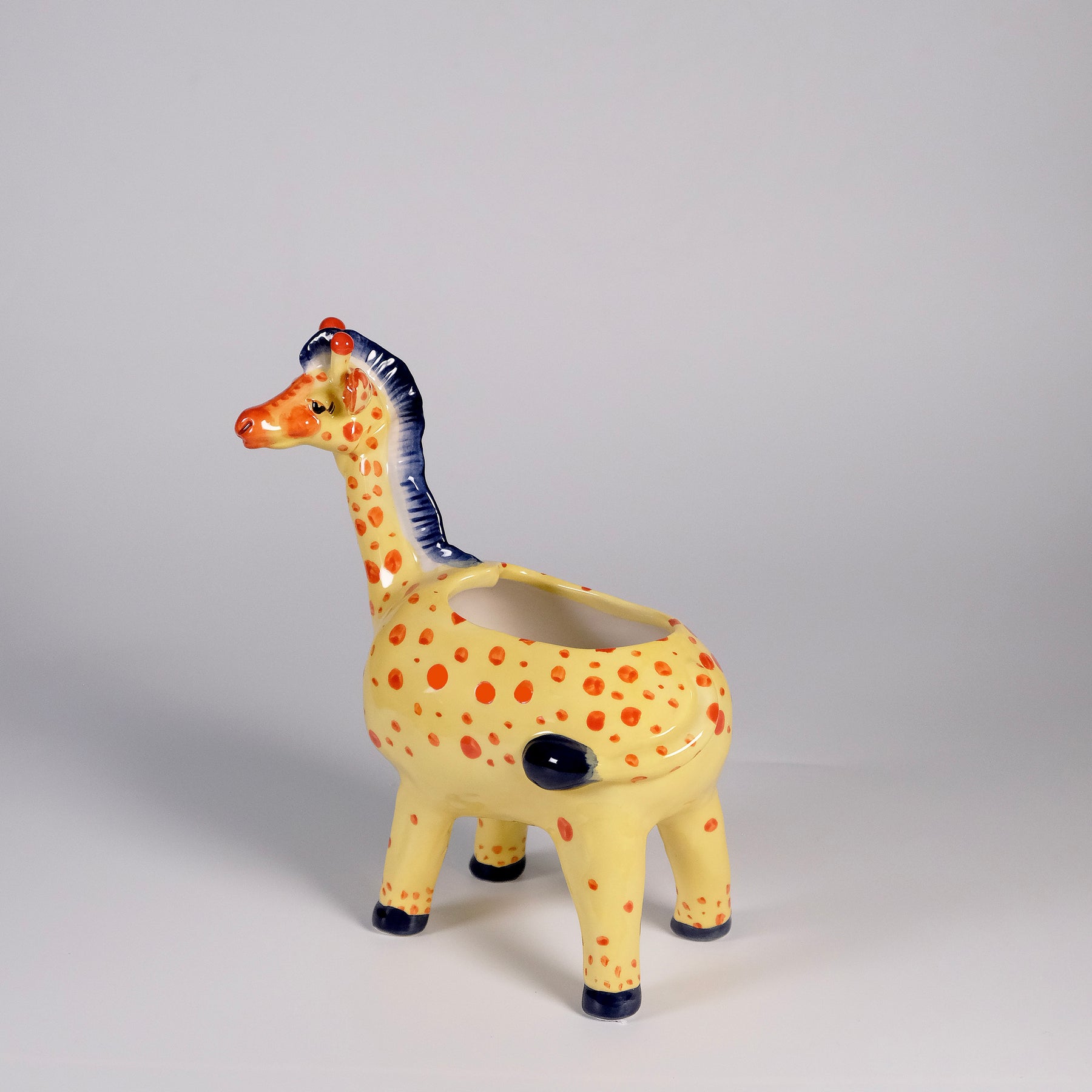 Add a playful touch of the savanna to your home with the Giraffe Planter. Standing tall and cheerful, this hand-painted ceramic giraffe features bright orange spots, expressive eyes, and a glossy finish that brings personality to any space. A Heather Goldminc original design, its whimsical design makes it the perfect companion for small plants, succulents, or fresh blooms. 🦒💛
