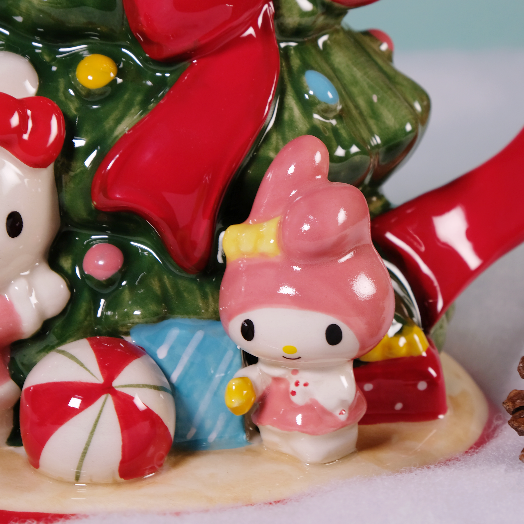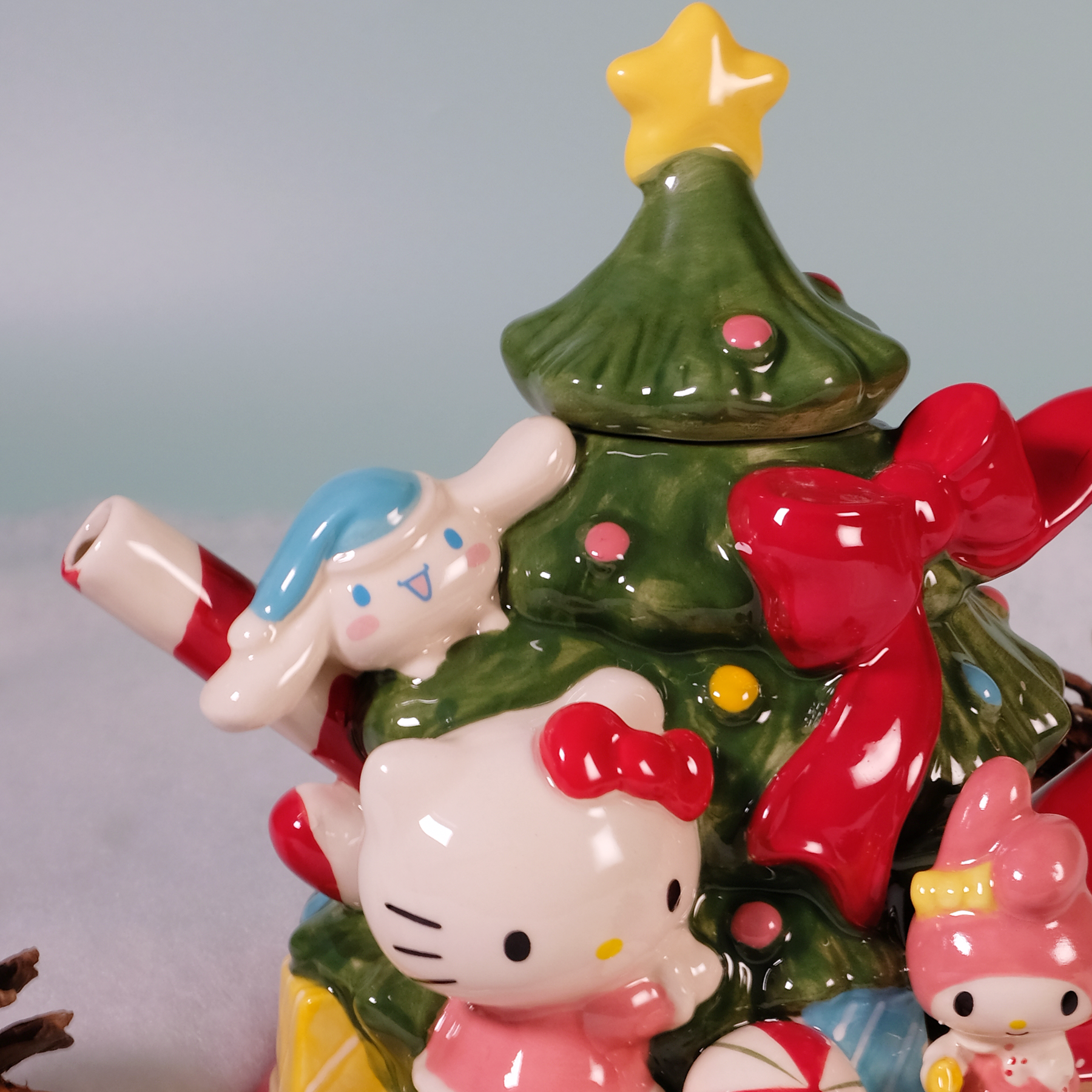 Hand-painted in festive colors, this charming ceramic teapot features Hello Kitty, My Melody, and Cinnamoroll gathered around a sparkling Christmas tree topped with a golden star and wrapped in a bright red bow. Every detail — from the candy-striped ornaments to the gift-filled base — captures the warmth and wonder of the season. 🎀✨
