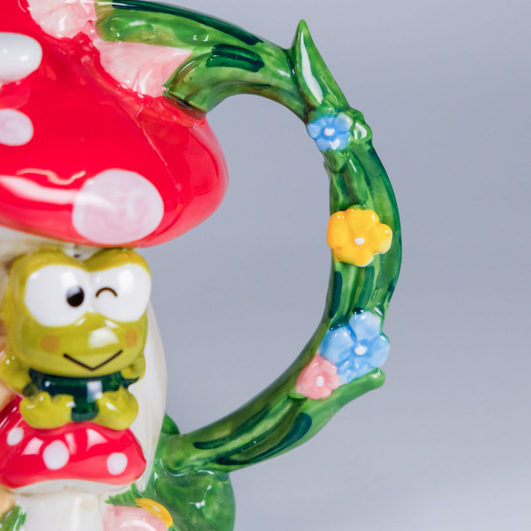 This charming ceramic teapot is designed as an adorable mushroom cottage, complete with a bright red polka-dot roof β€οΈπ and lush garden details πΌπΏ. Peek around the house to find Hello Kitty sweetly holding a basket, Keroppi popping by for a visit πΈ, and Cinnamoroll smiling from above βοΈπ β all lovingly sculpted in delightful 3D detail. A delicate butterfly rests atop the lid π¦, adding the perfect finishing touch to this enchanted scene.