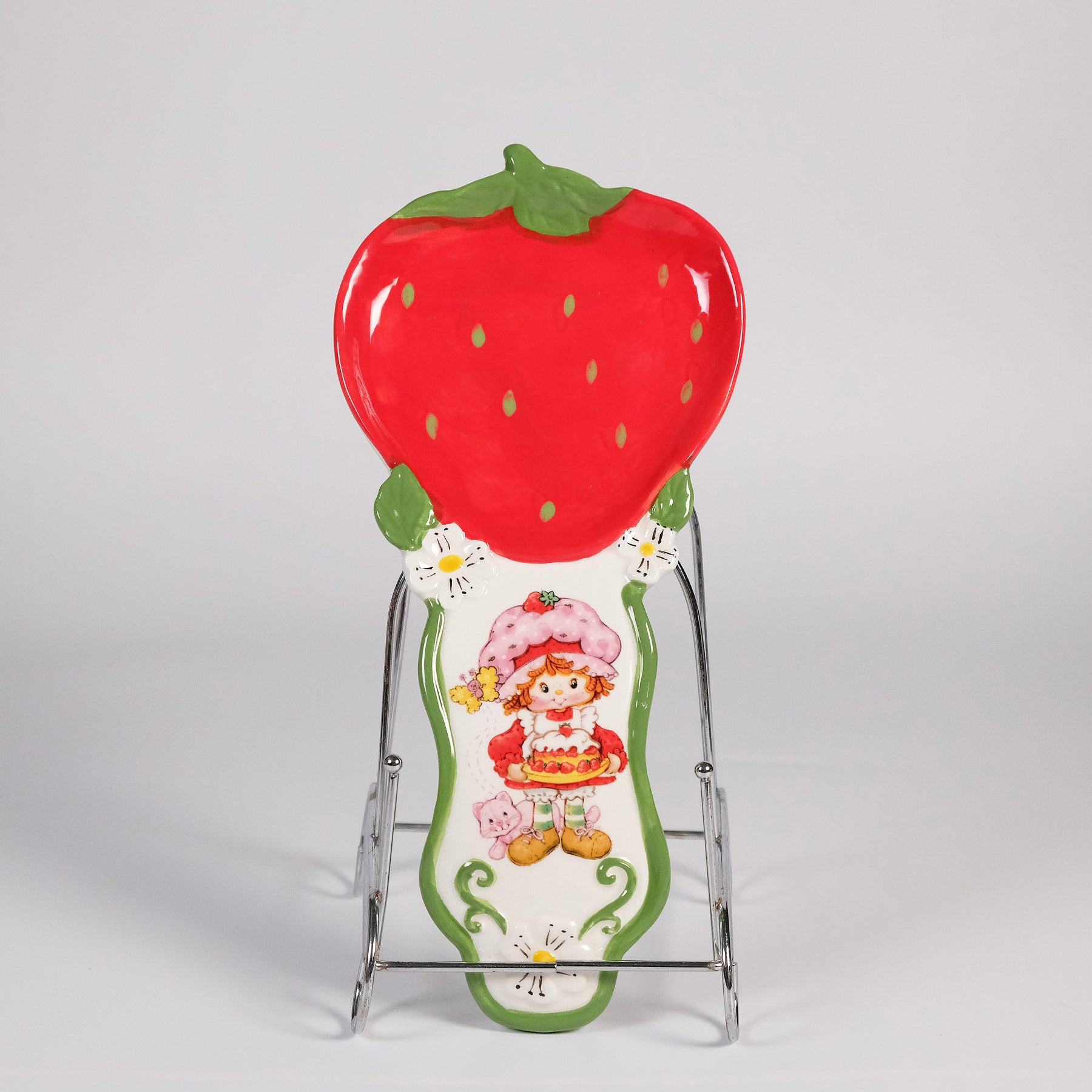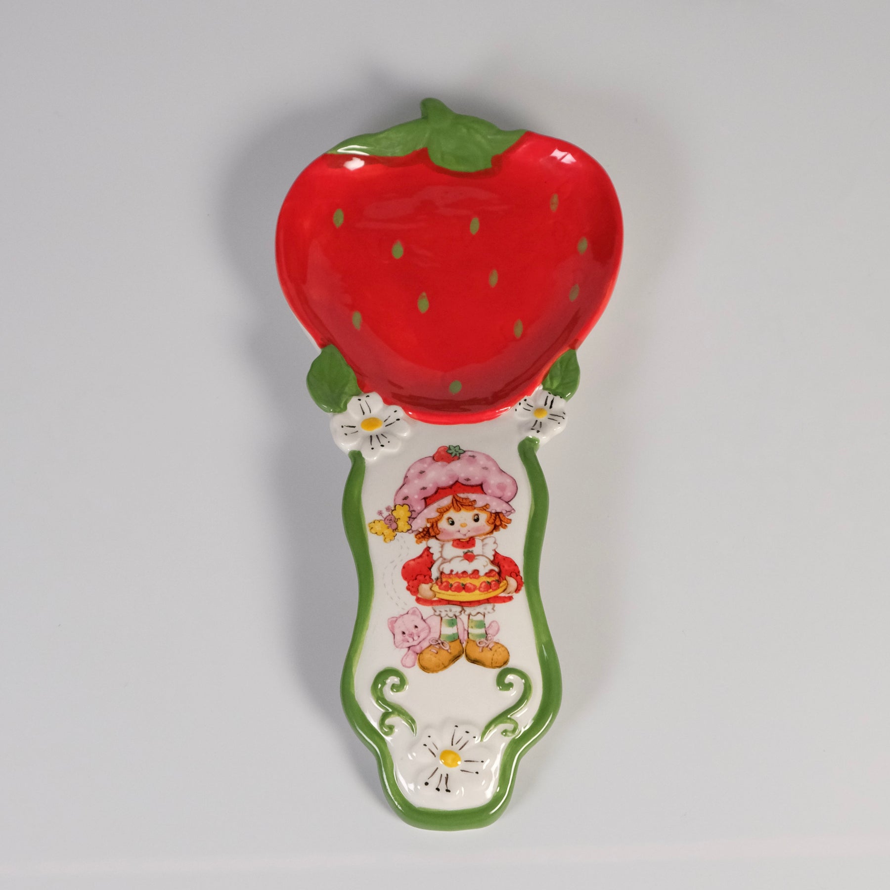 Add a dash of sweetness to your kitchen with the Strawberry & Orange Spoon Rest. This charming ceramic piece features a bright red strawberry top and a cheerful illustration of Strawberry Shortcake holding a delicious dessert, surrounded by dainty flowers and playful details. 🍓🥄