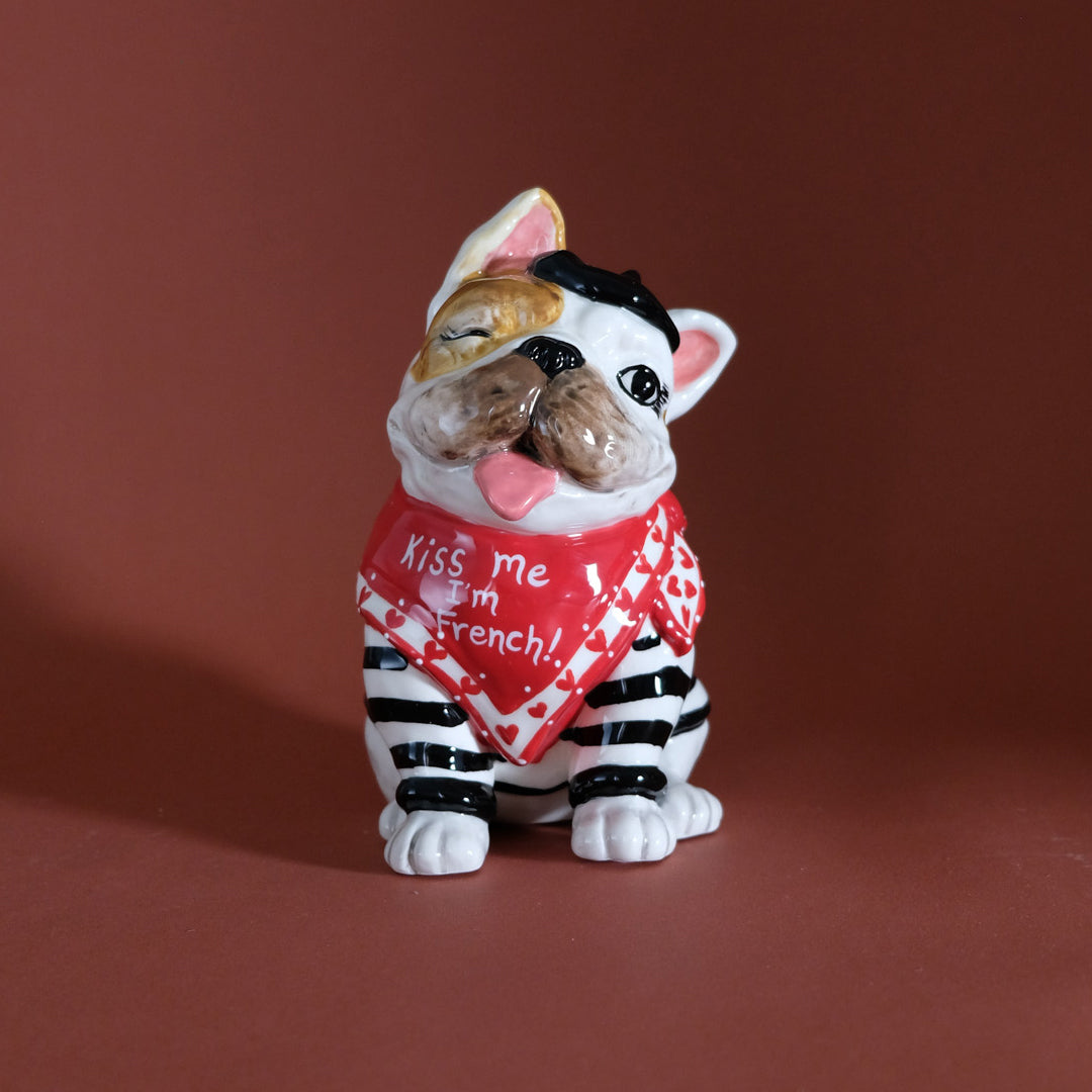 This charming ceramic pup is full of personality, from its playful wink 😉 to its cheeky pink tongue sticking out. Dressed in classic black-and-white stripes and a red heart-covered bandana that reads “Kiss Me I’m French!” ❤️, this figurine brings humor, romance, and Parisian-inspired charm all in one adorable package.