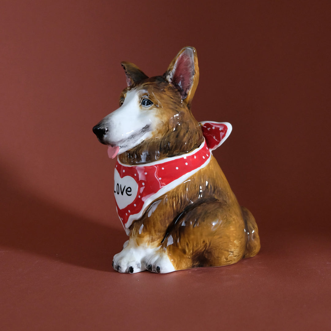 This sweet little corgi is bursting with charm and affection! Featuring a happy expression, perked ears, and a bright red bandana that reads “LOVE,” this ceramic figurine perfectly captures the playful and loyal spirit corgis are known for 🐾✨. The glossy finish and hand-painted details bring this lovable pup to life, from its tiny paws to its cheerful tongue-out smile.