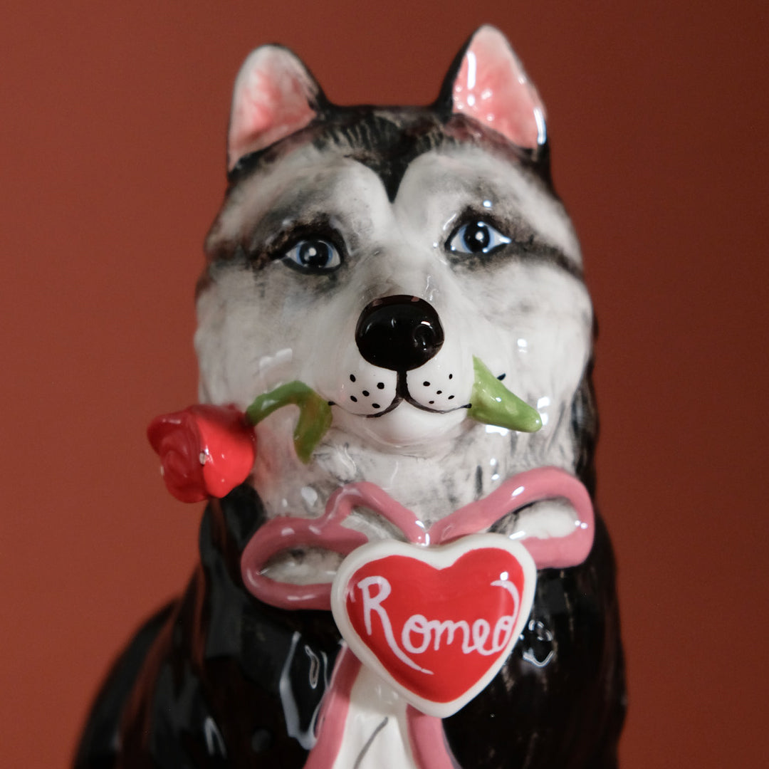 This sweet ceramic pup is the ultimate romantic, holding a delicate red rose in his mouth and wearing a heart-shaped pendant that reads “Romeo” 💕. With soulful eyes, perked ears, and a beautifully sculpted sitting pose, this figurine captures love, loyalty, and devotion in the most heartwarming way.