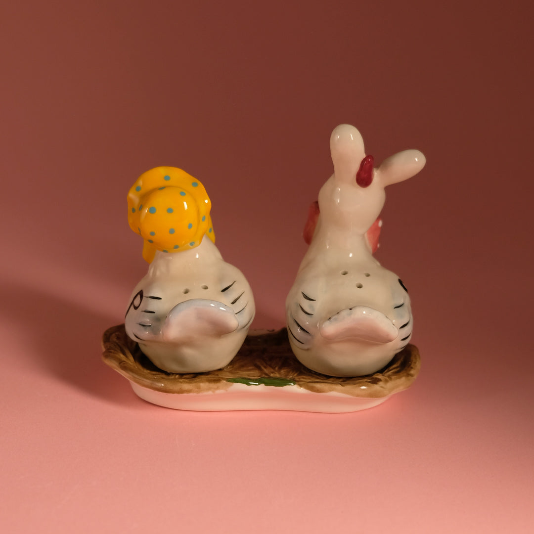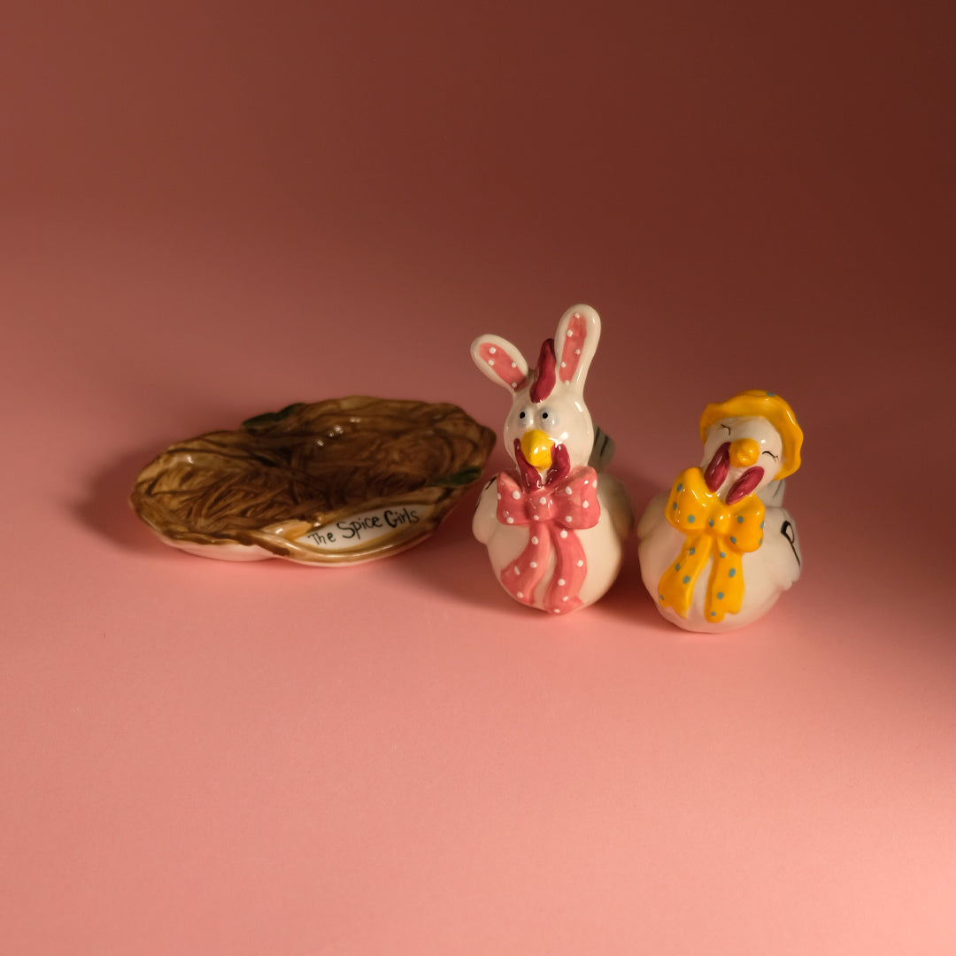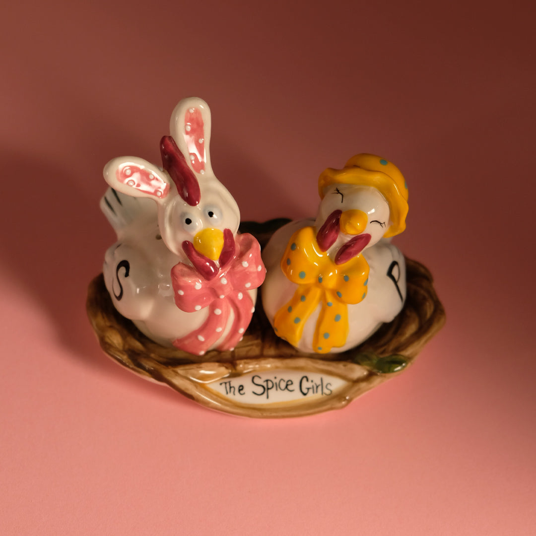 This delightful ceramic set features two whimsical hen-shaped shakers, each styled with playful bows and expressive details that give them plenty of personality. Perched together on a coordinating tray labeled “The Spice Girls,” they bring a cozy, farmhouse-inspired feel with a lighthearted twist. The contrasting colors and hand-painted accents make this set as decorative as it is functional. 🐔✨