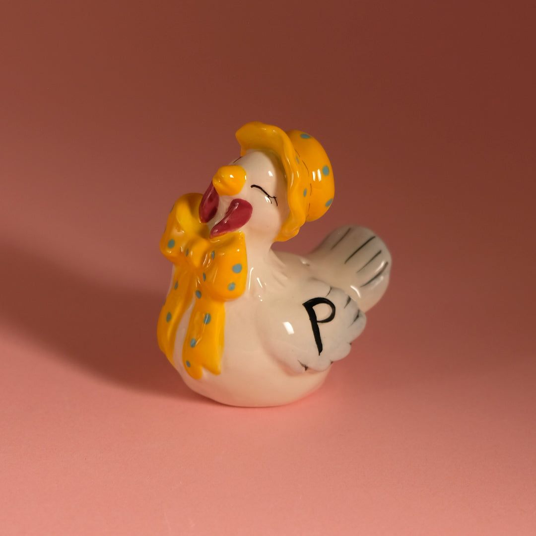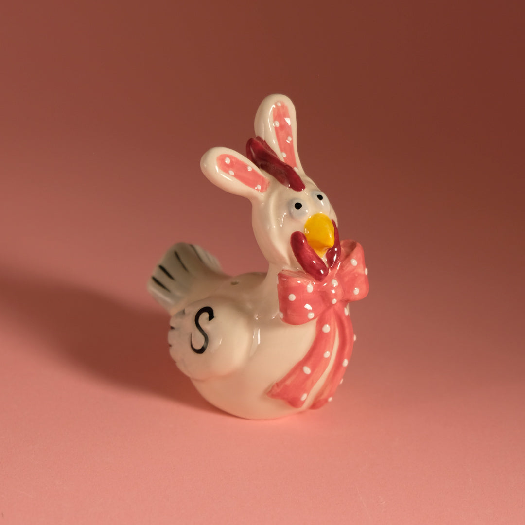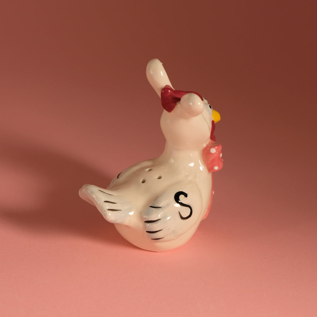 This delightful ceramic set features two whimsical hen-shaped shakers, each styled with playful bows and expressive details that give them plenty of personality. Perched together on a coordinating tray labeled “The Spice Girls,” they bring a cozy, farmhouse-inspired feel with a lighthearted twist. The contrasting colors and hand-painted accents make this set as decorative as it is functional. 🐔✨