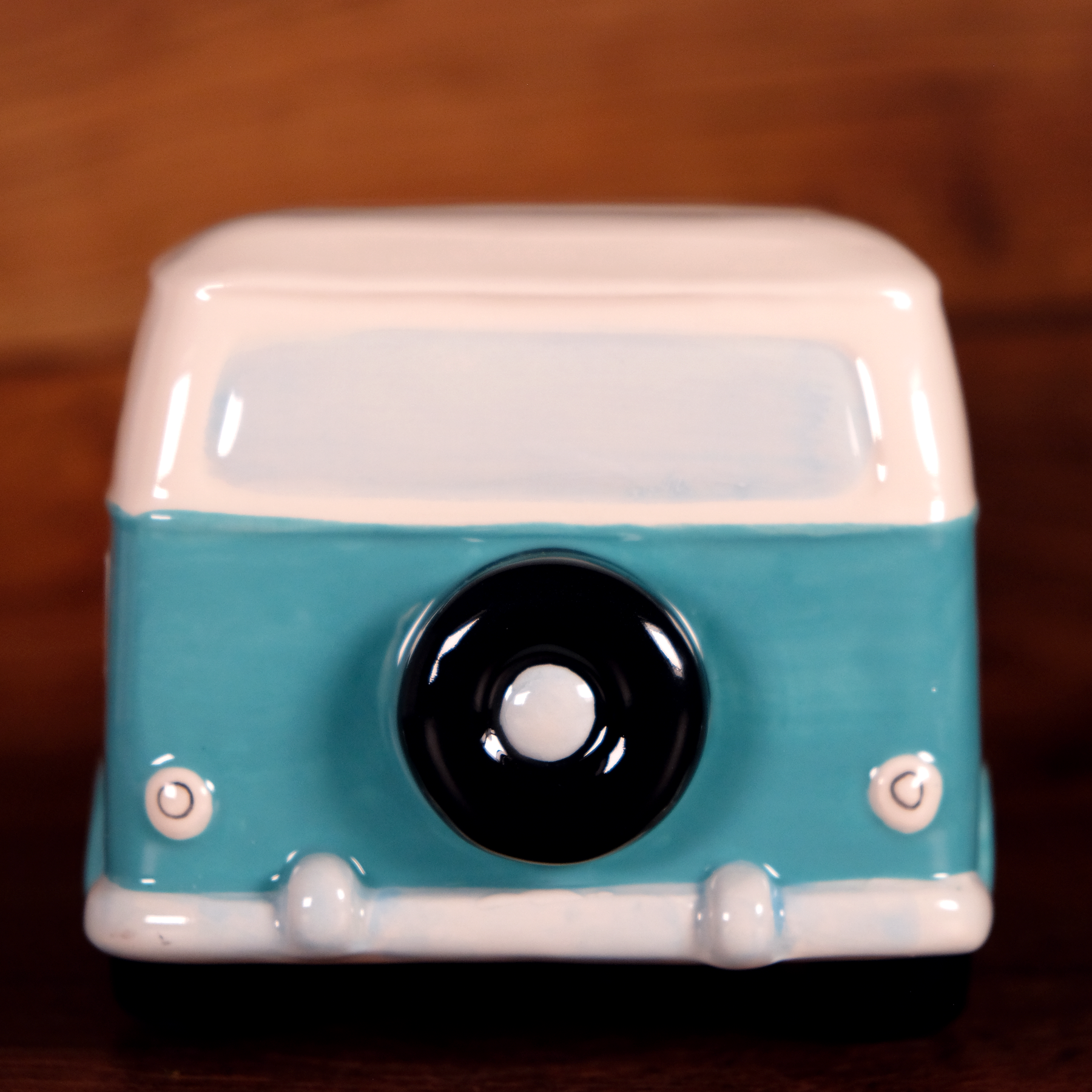 Hand-painted in a vintage-inspired turquoise and white finish, this adorable bus design captures the carefree spirit of travel and adventure. With its retro details — from the rounded headlights to the pink window curtains — it’s a perfect blend of nostalgia and whimsy.