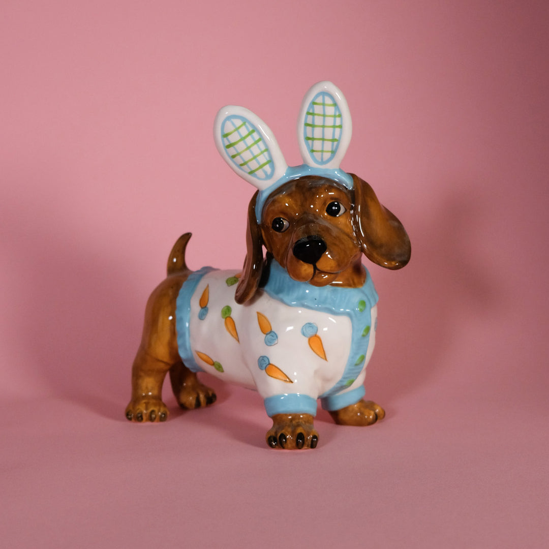 This delightful ceramic dachshund is dressed to impress in the cutest bunny-inspired outfit, complete with tall rabbit ears and a cozy white sweater sprinkled with cheerful carrots π₯β¨. With its sweet expression, floppy ears, and glossy hand-painted finish, this little pup perfectly blends playful whimsy with irresistible charm.