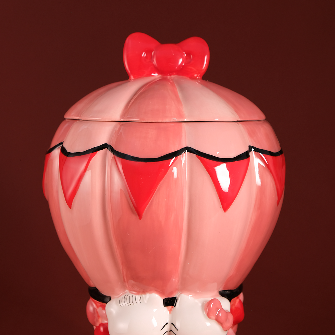 Drifting somewhere between nostalgia and daydream, this ceramic cookie jar reimagines Hello Kitty and Dear Daniel in the sweetest way. Designed as a blush-toned hot air balloon, the piece features the pair nestled together in the basket below, finished with a bright red heart for a subtle romantic touch.