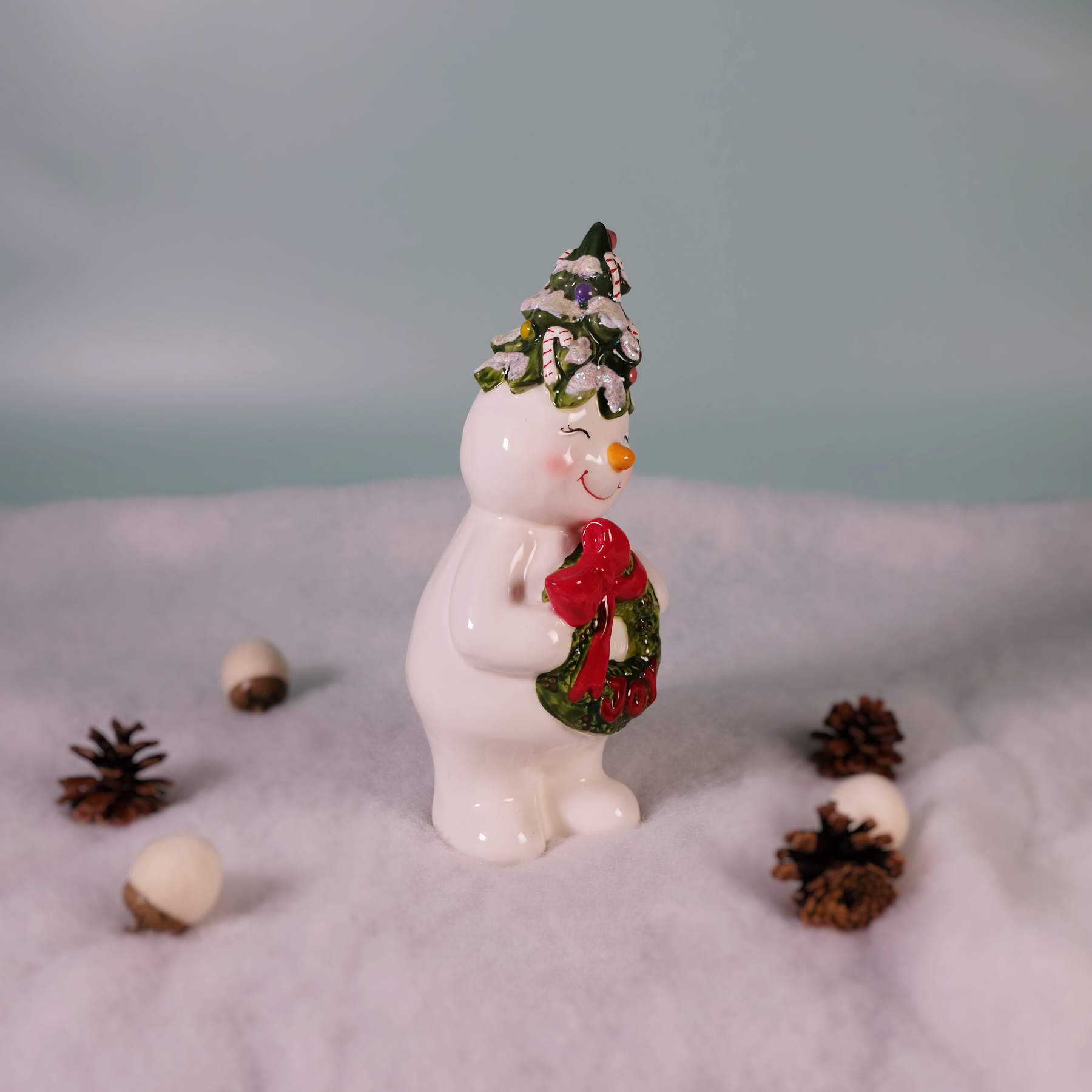 Hand-painted with a warm smile and rosy cheeks, this cheerful snowman holds a glittering green wreath tied with a bright red bow that spells “JOY.” His festive Christmas tree hat, complete with candy canes and shimmering snow accents, adds a touch of whimsy and nostalgia to your holiday décor. ☃️